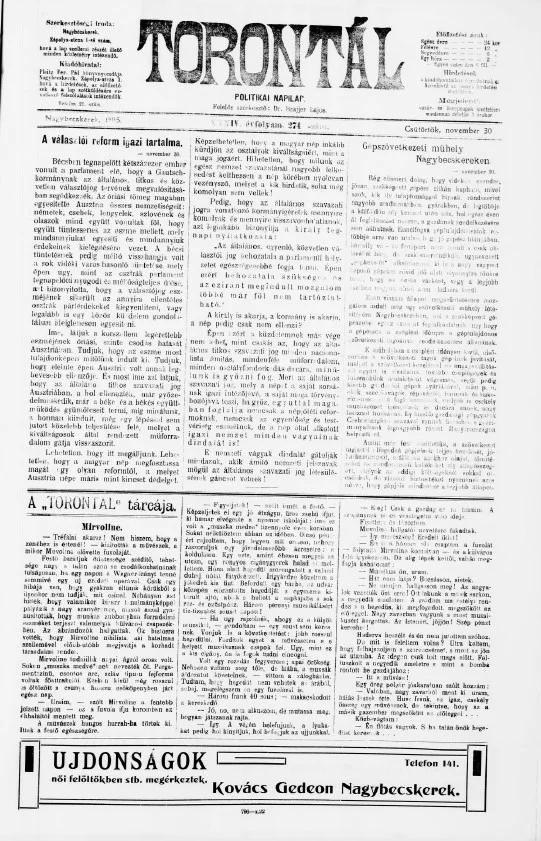 Torontál, 34. évf. 1905. november 30. 274. sz.