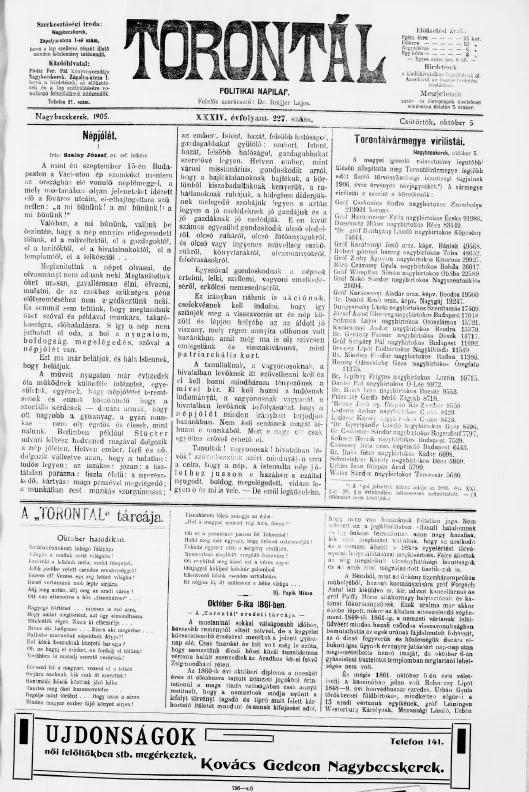 Torontál, 34. évf. 1905. október 5. 227. sz.