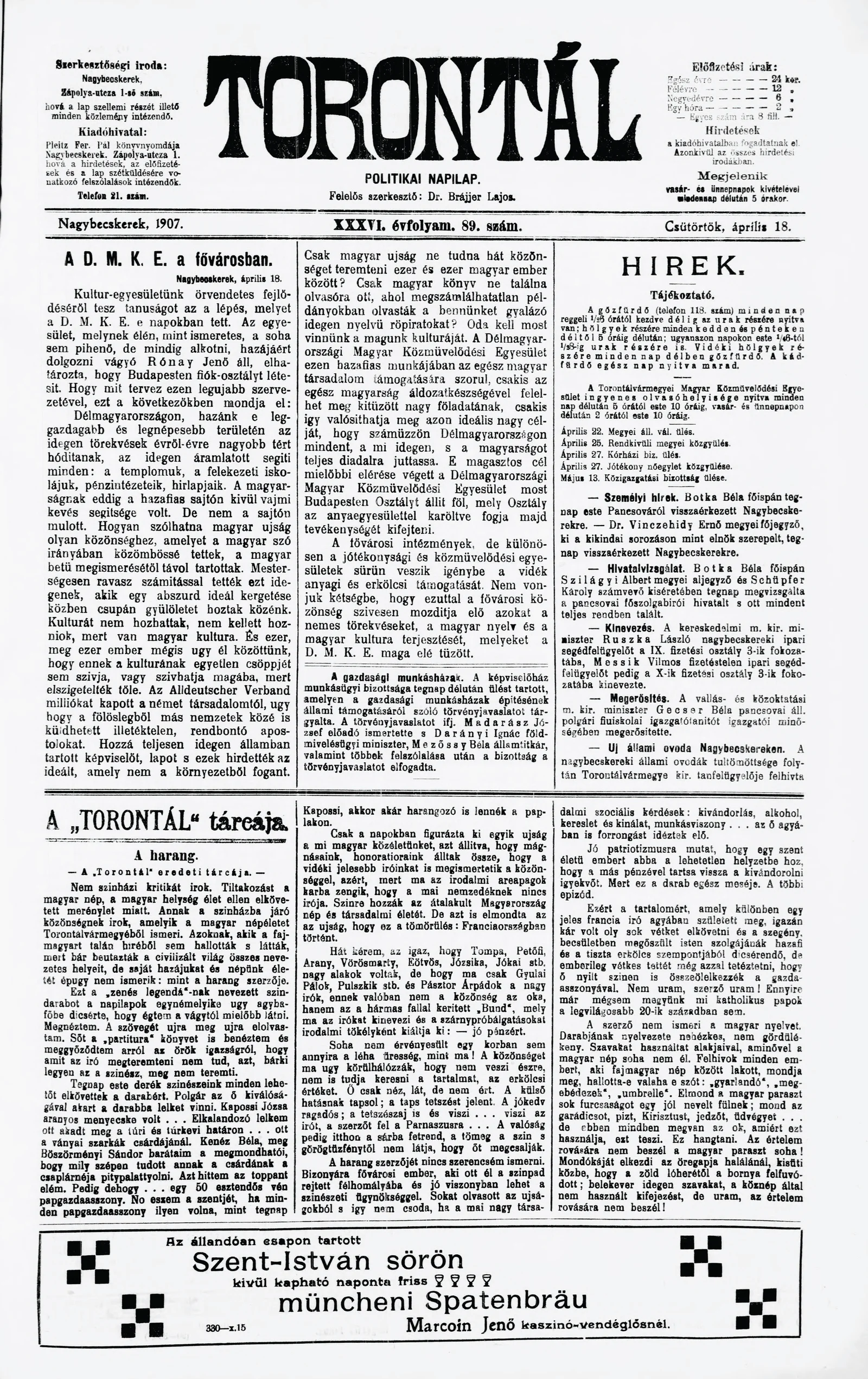 Torontál, 36. évf. 1907. április 18. 89. sz.