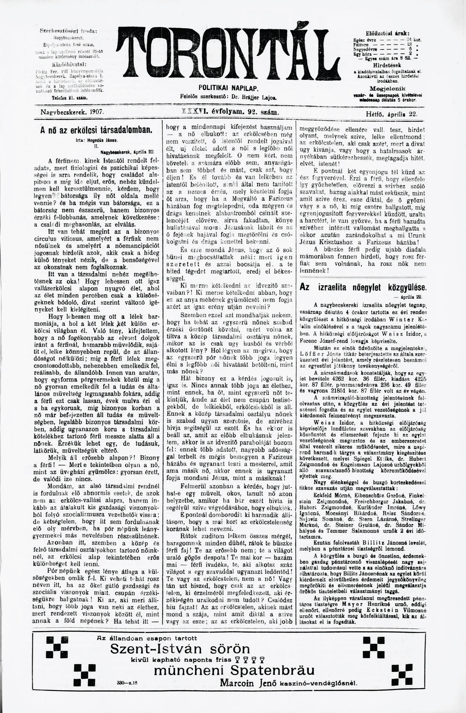 Torontál, 36. évf. 1907. április 22. 92. sz.