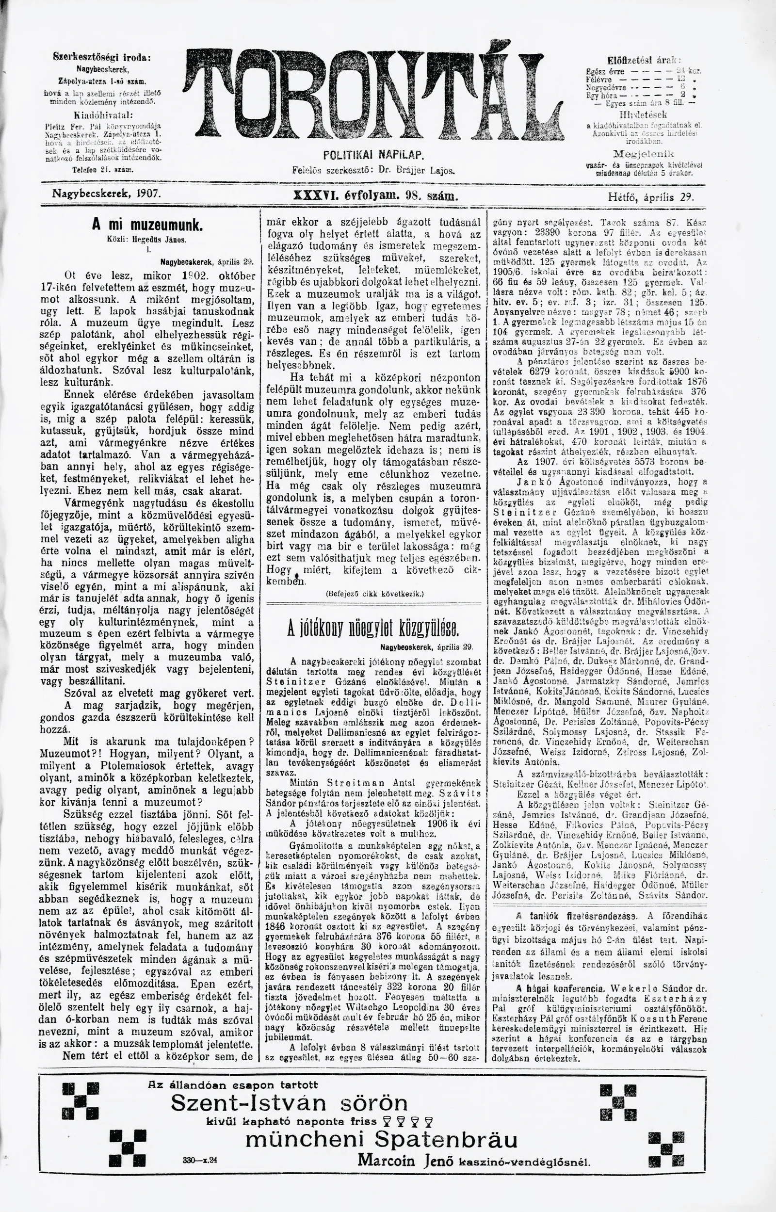 Torontál, 36. évf. 1907. április 29. 98. sz.