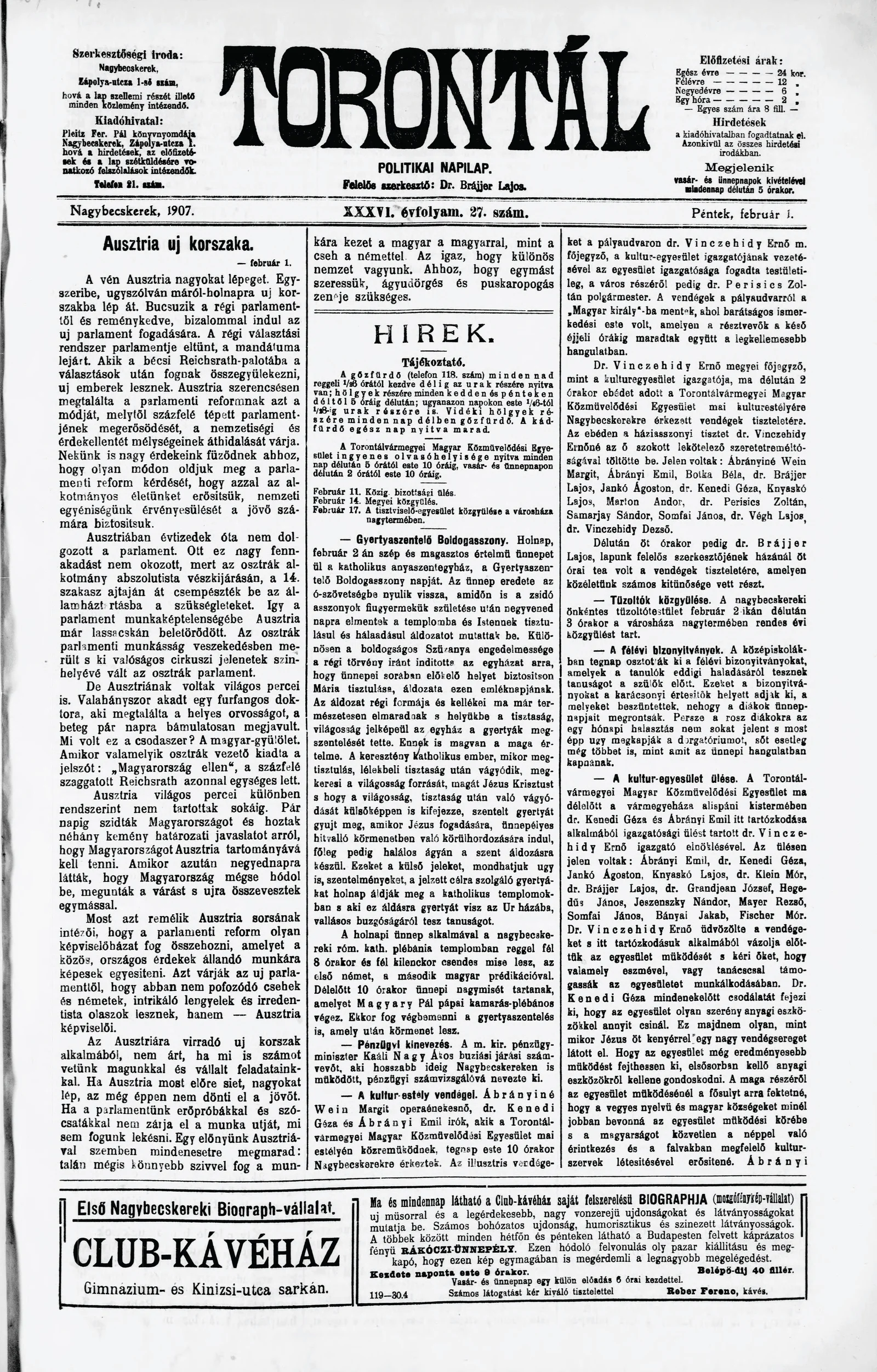 Torontál, 36. évf. 1907. február 1. 27. sz.