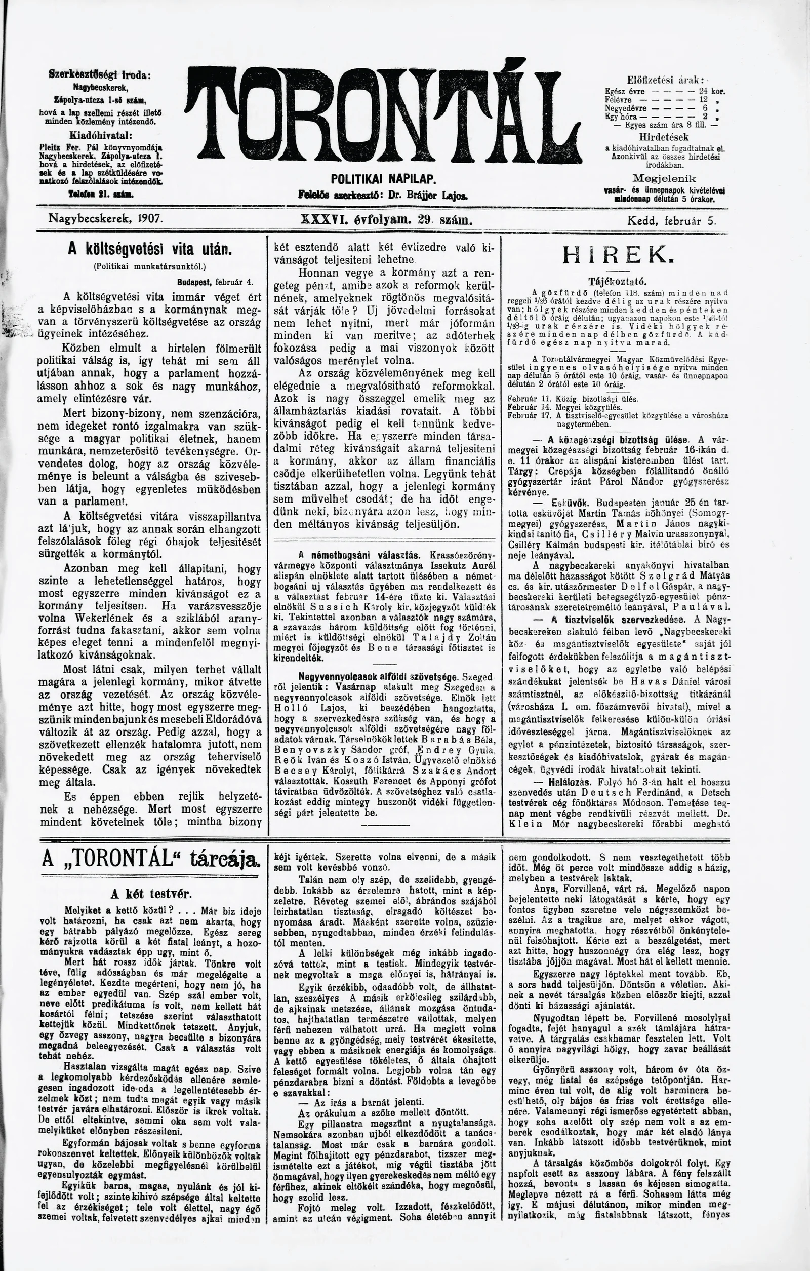 Torontál, 36. évf. 1907. február 5. 29. sz.