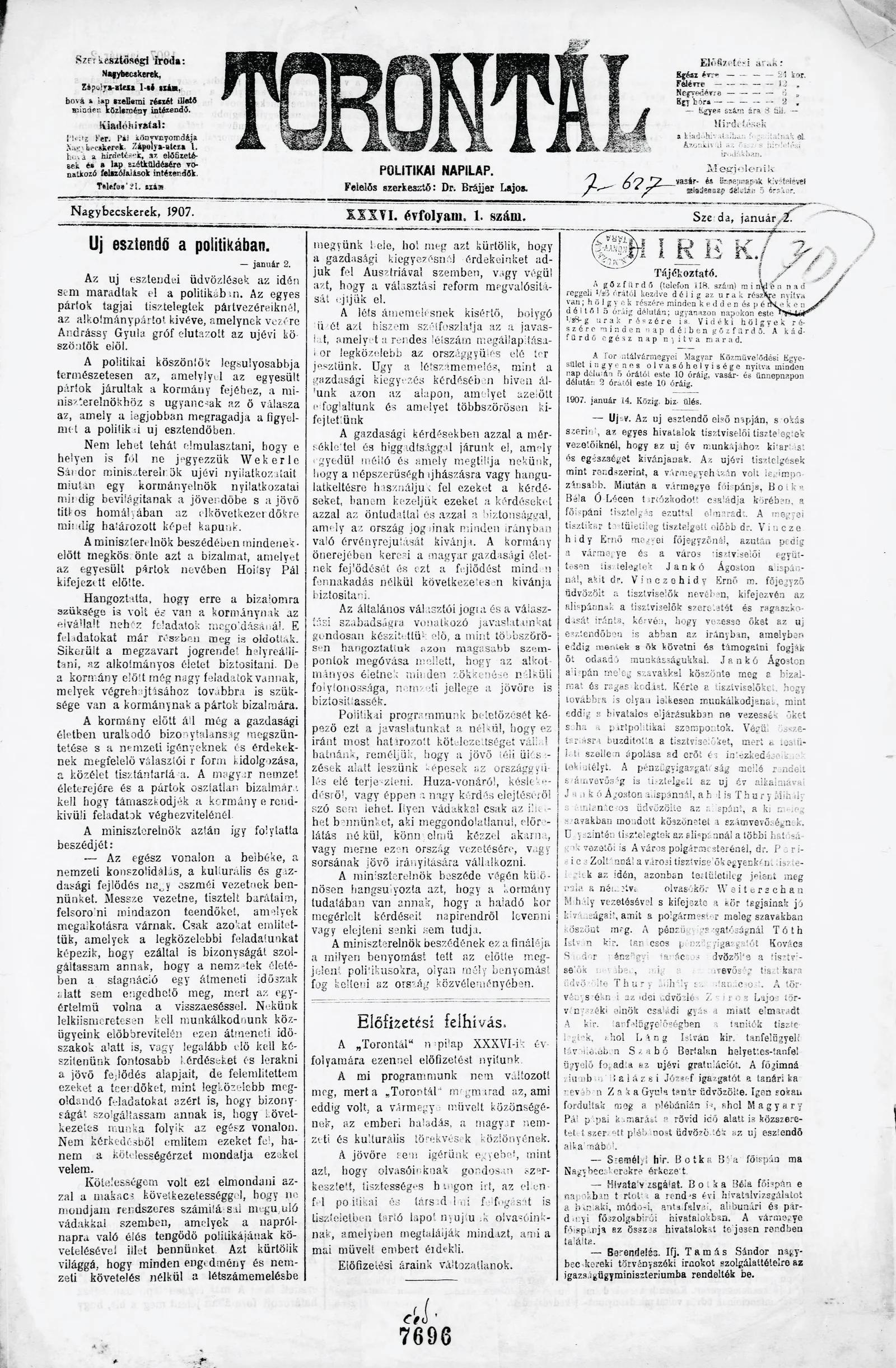 Torontál, 36. évf. 1907. január 2. 1. sz.