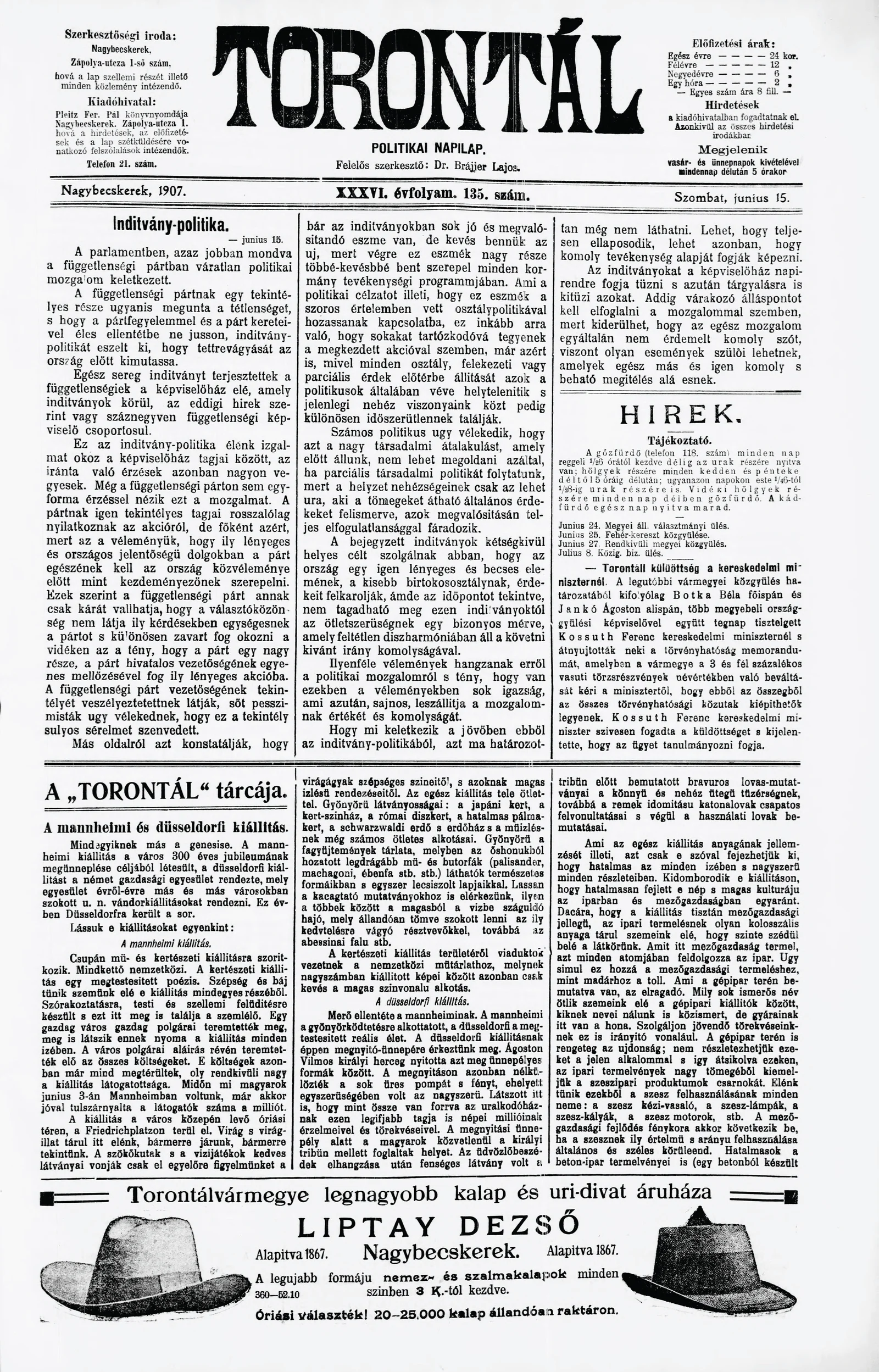 Torontál, 36. évf. 1907. június 15. 135. sz.