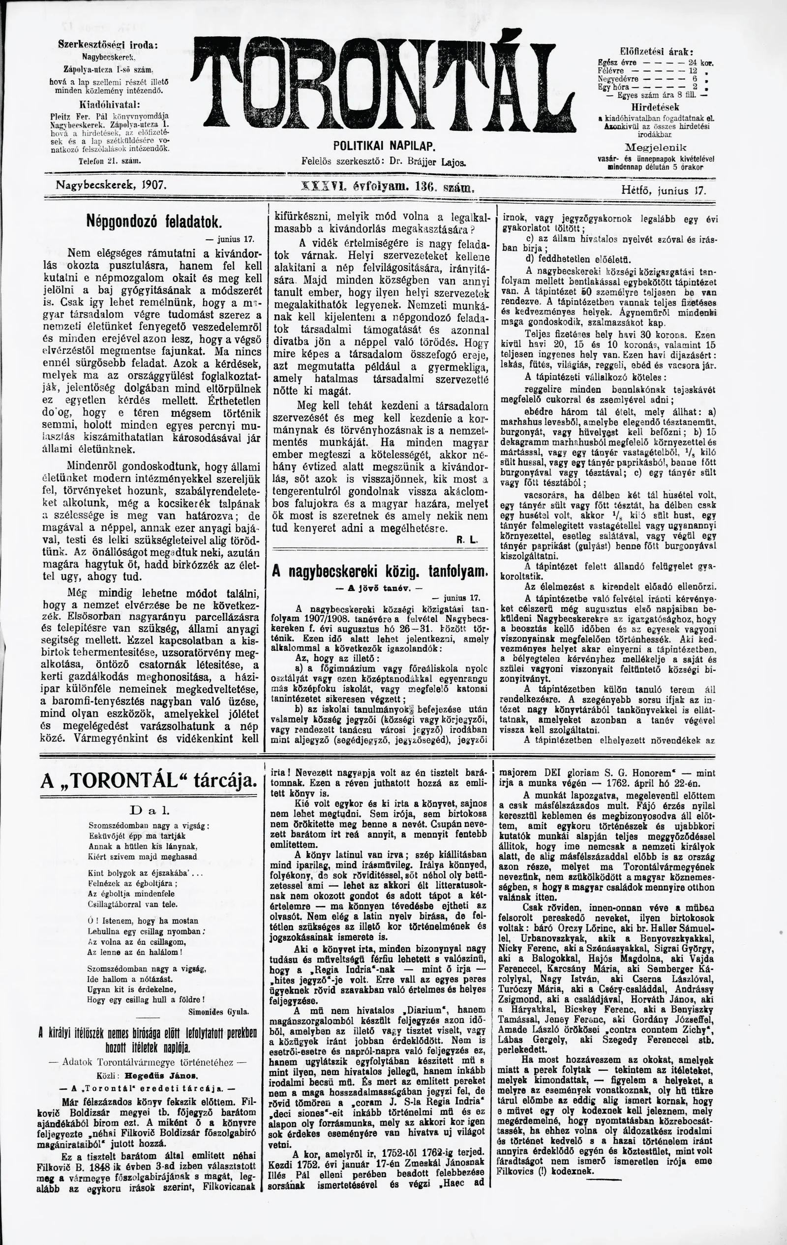 Torontál, 36. évf. 1907. június 17. 136. sz.