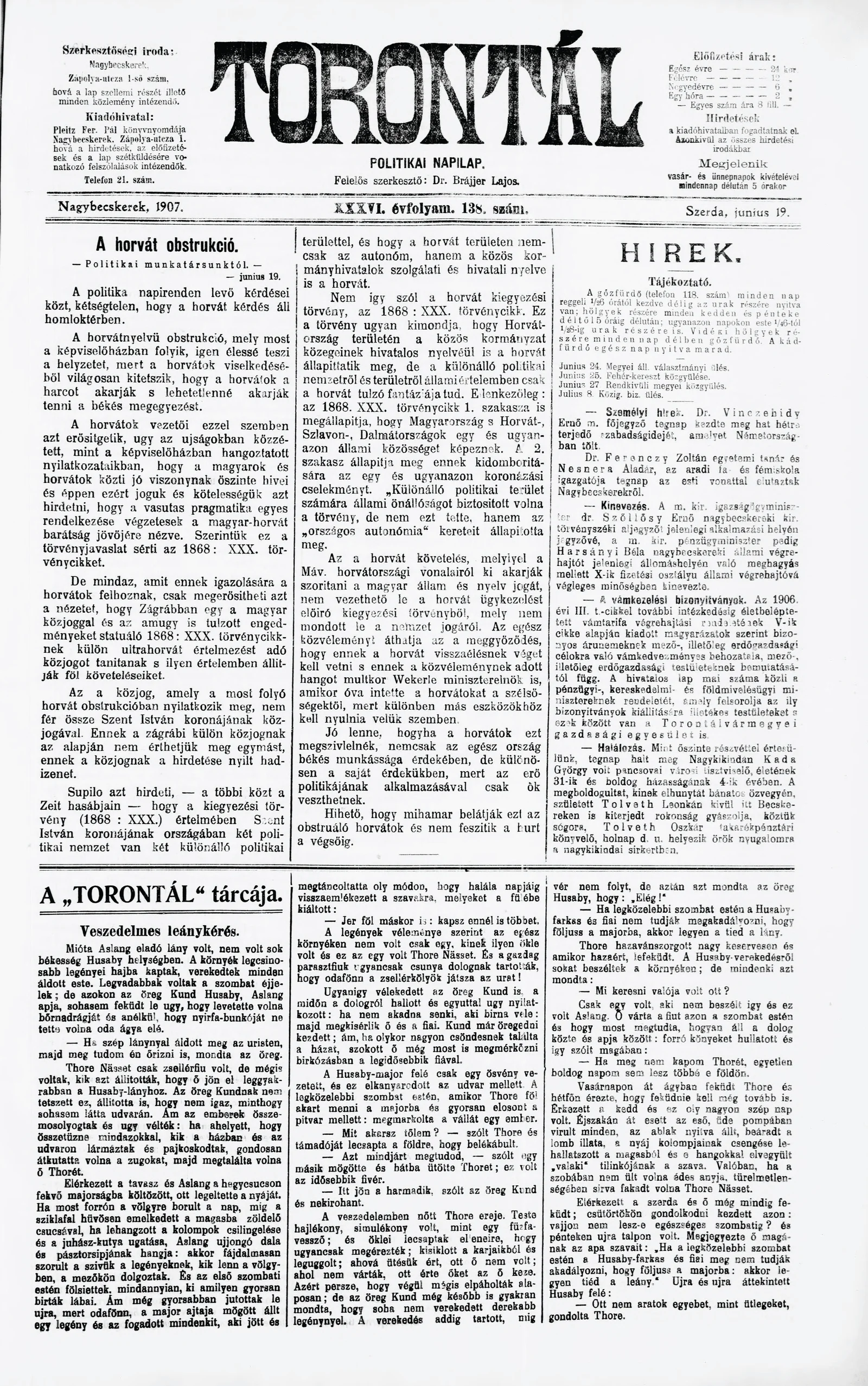 Torontál, 36. évf. 1907. június 19. 138. sz.
