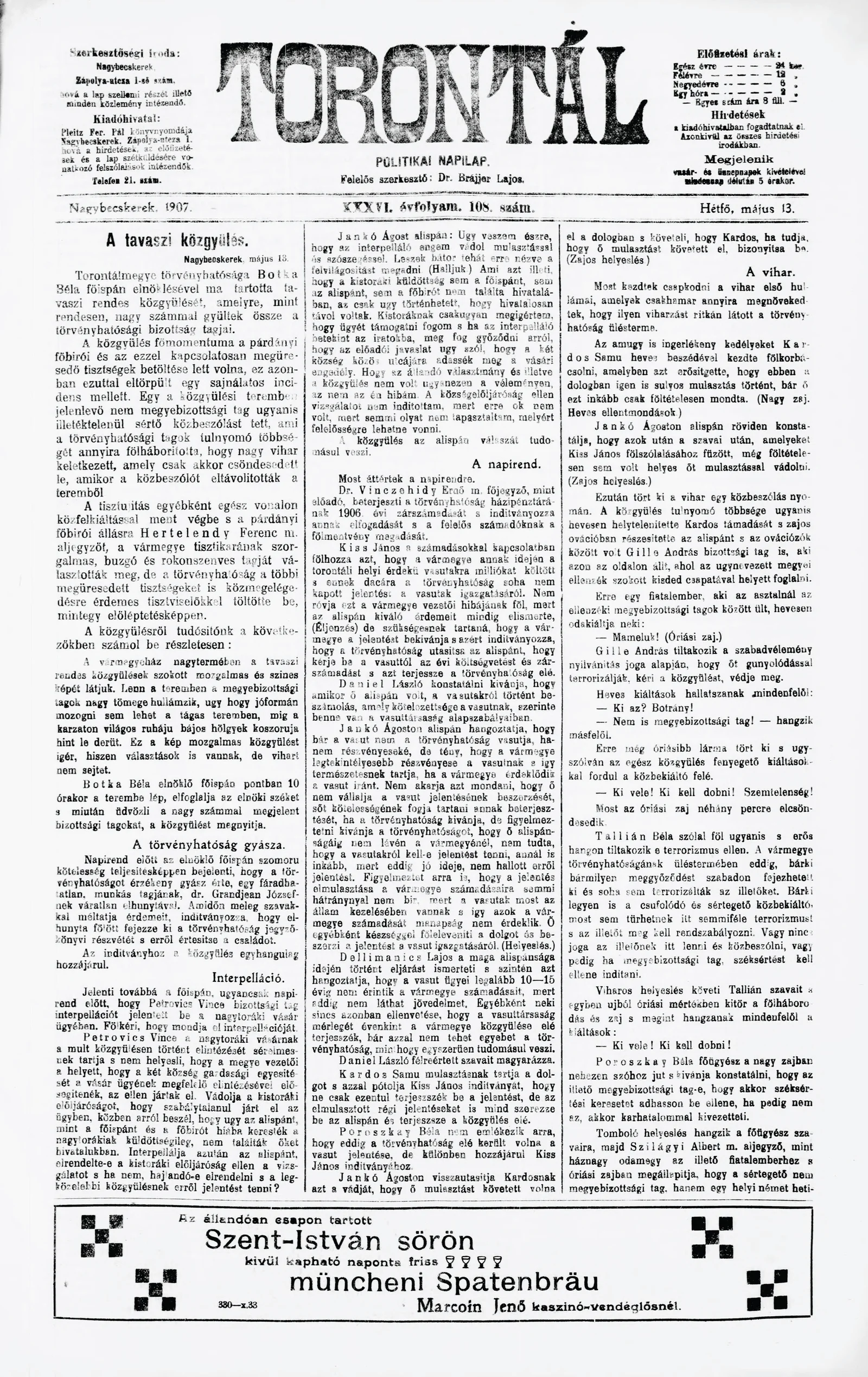 Torontál, 36. évf. 1907. május 13. 108. sz.