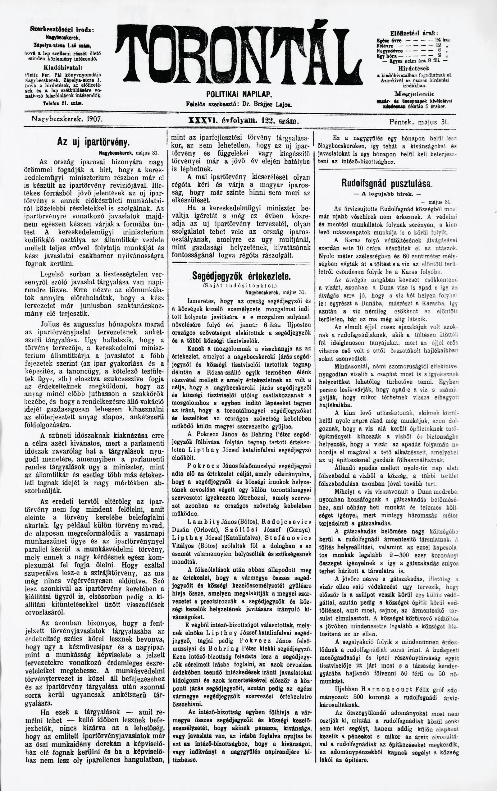 Torontál, 36. évf. 1907. május 31. 122. sz.