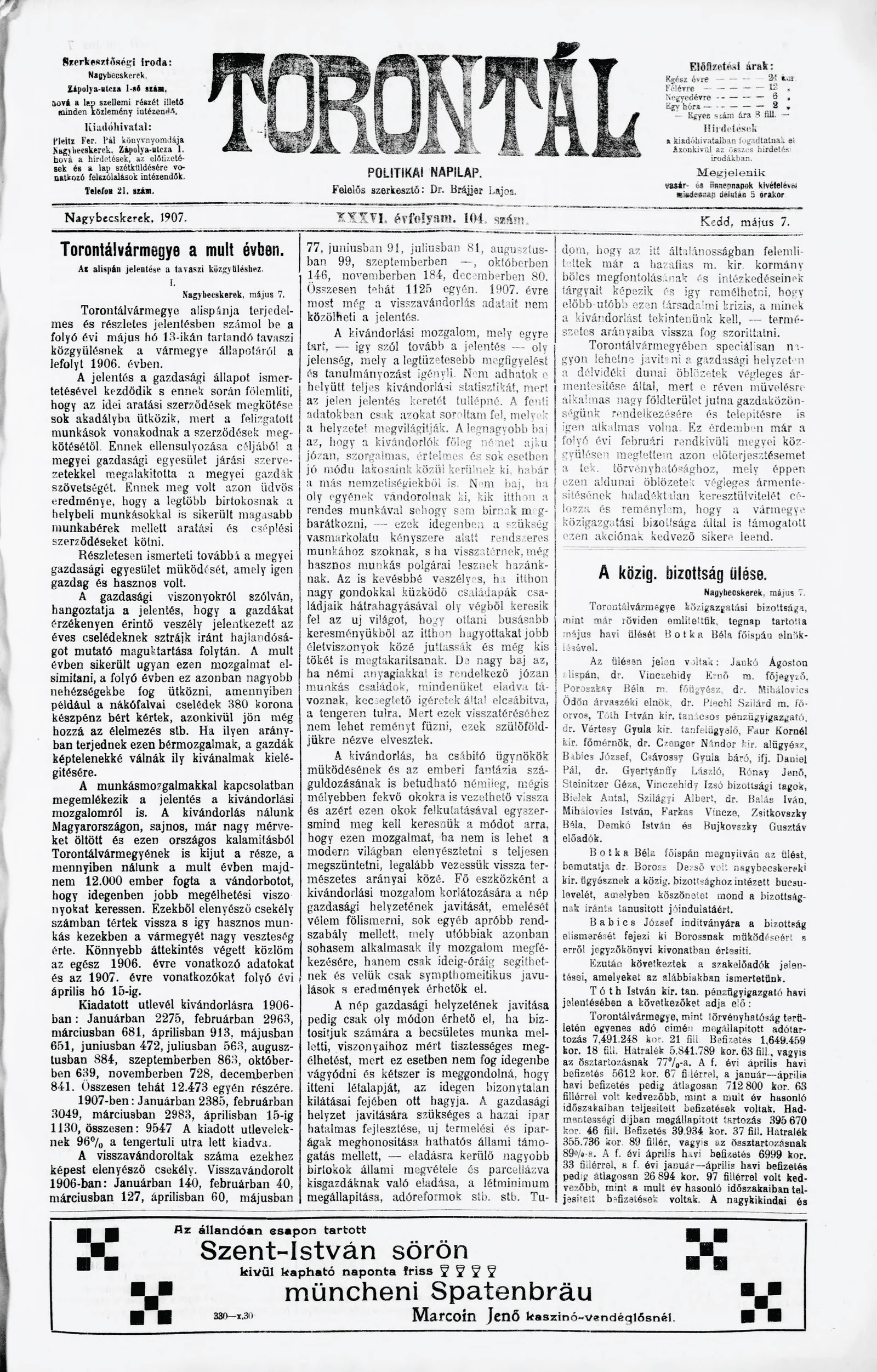 Torontál, 36. évf. 1907. május 7. 104. sz.