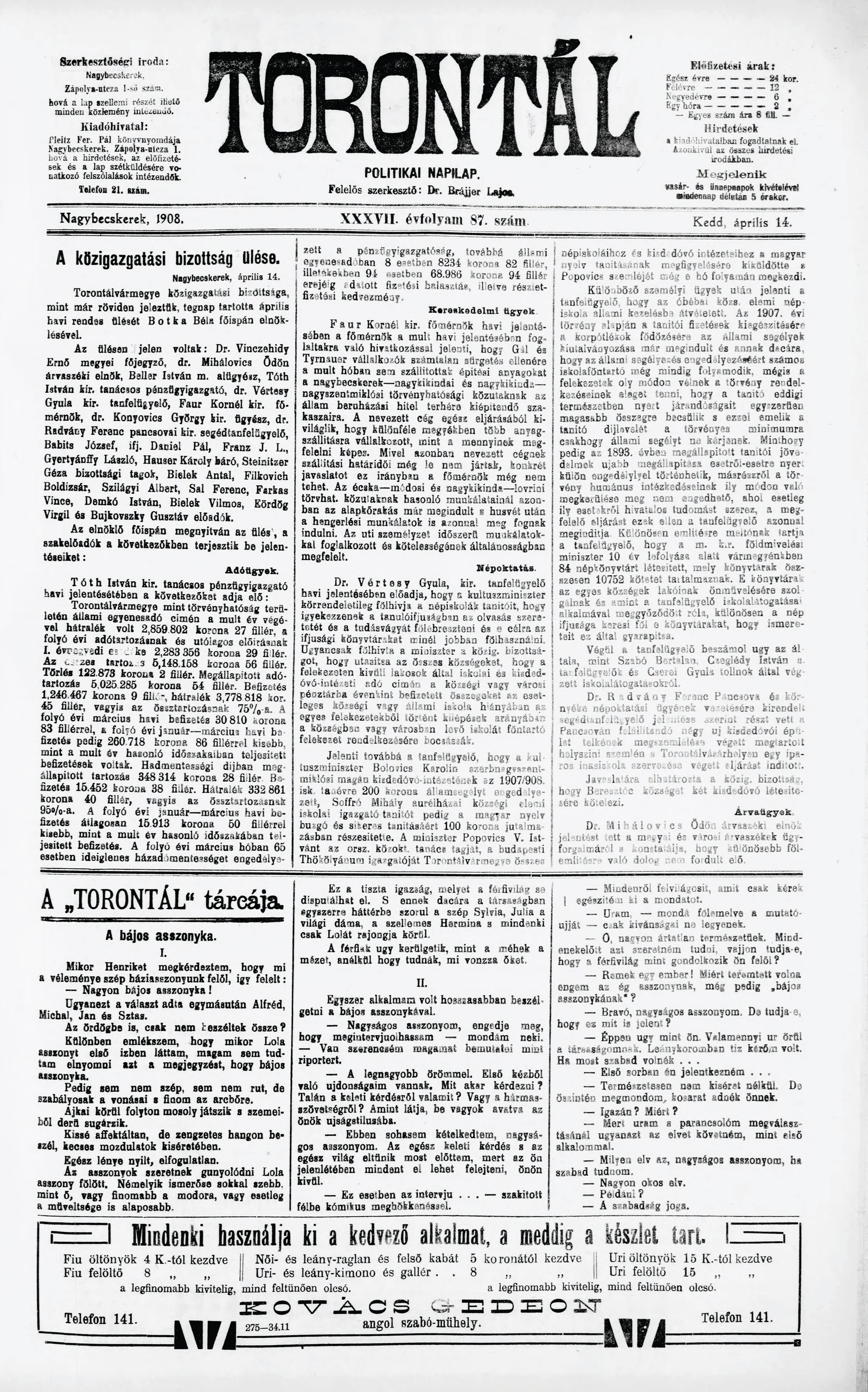 Torontál, 37. évf. 1908. április 14. 87. sz.