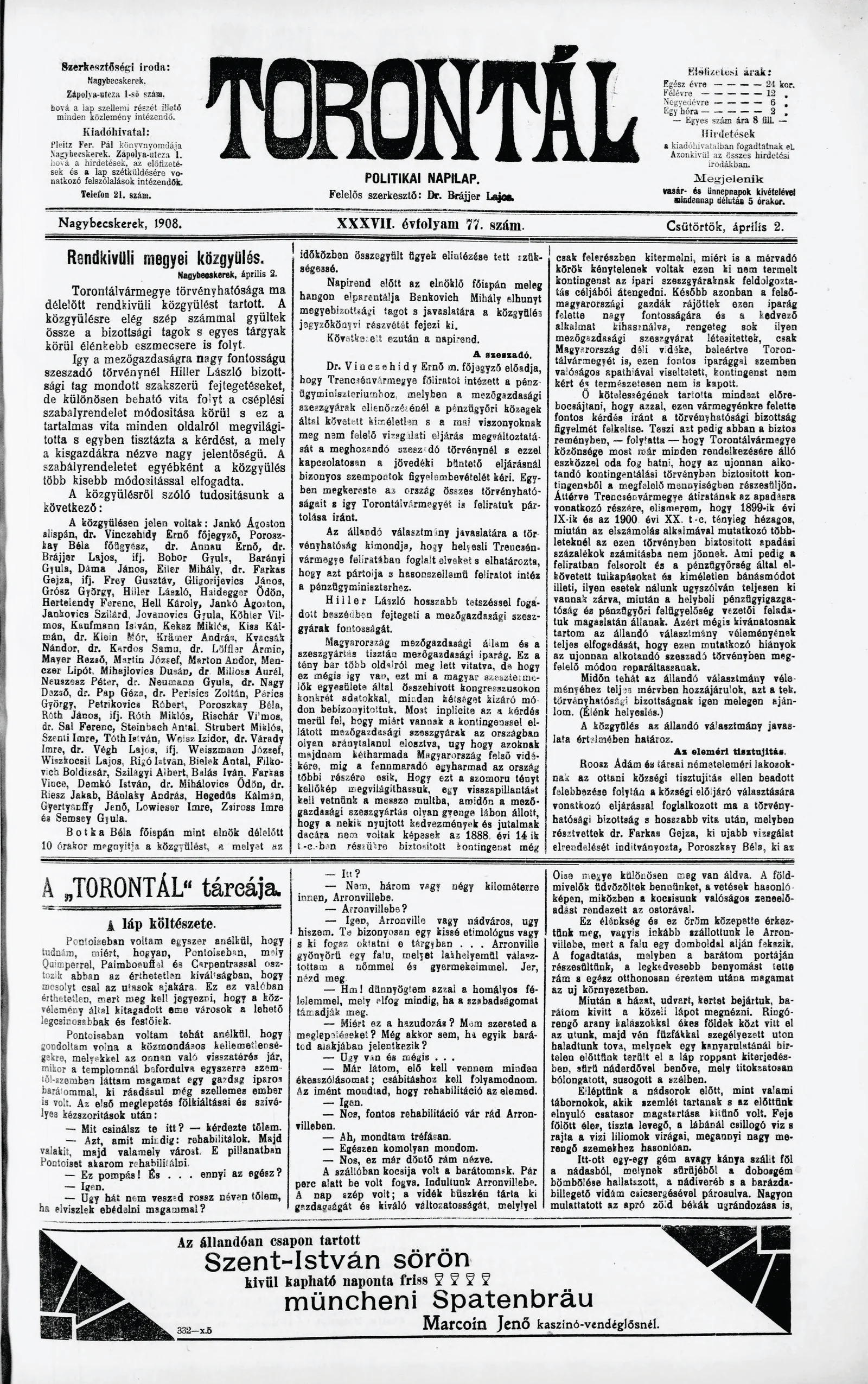 Torontál, 37. évf. 1908. április 2. 77. sz.