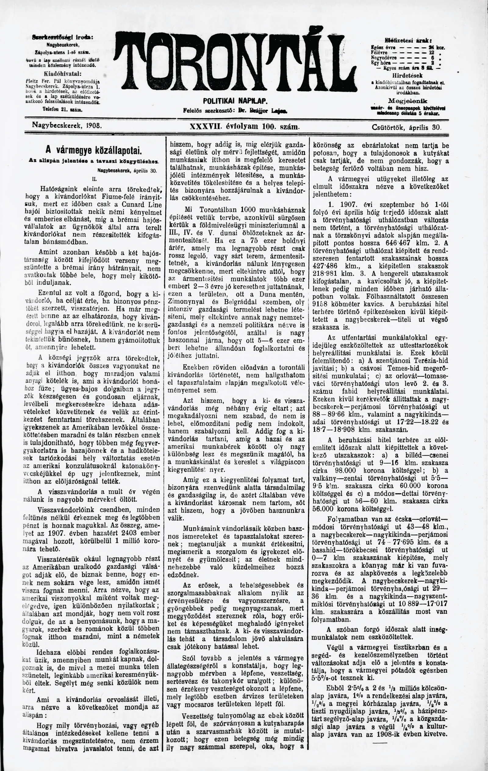 Torontál, 37. évf. 1908. április 30. 100. sz.