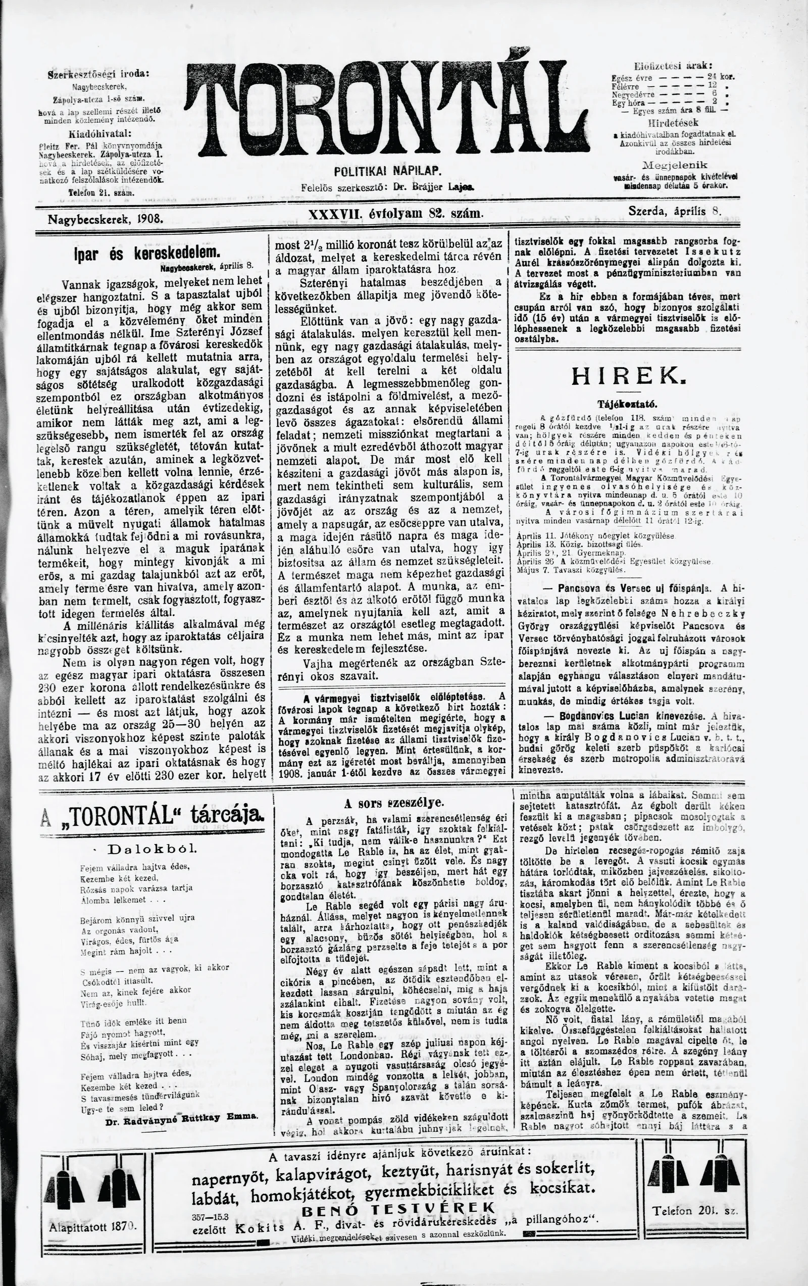 Torontál, 37. évf. 1908. április 8. 82. sz.