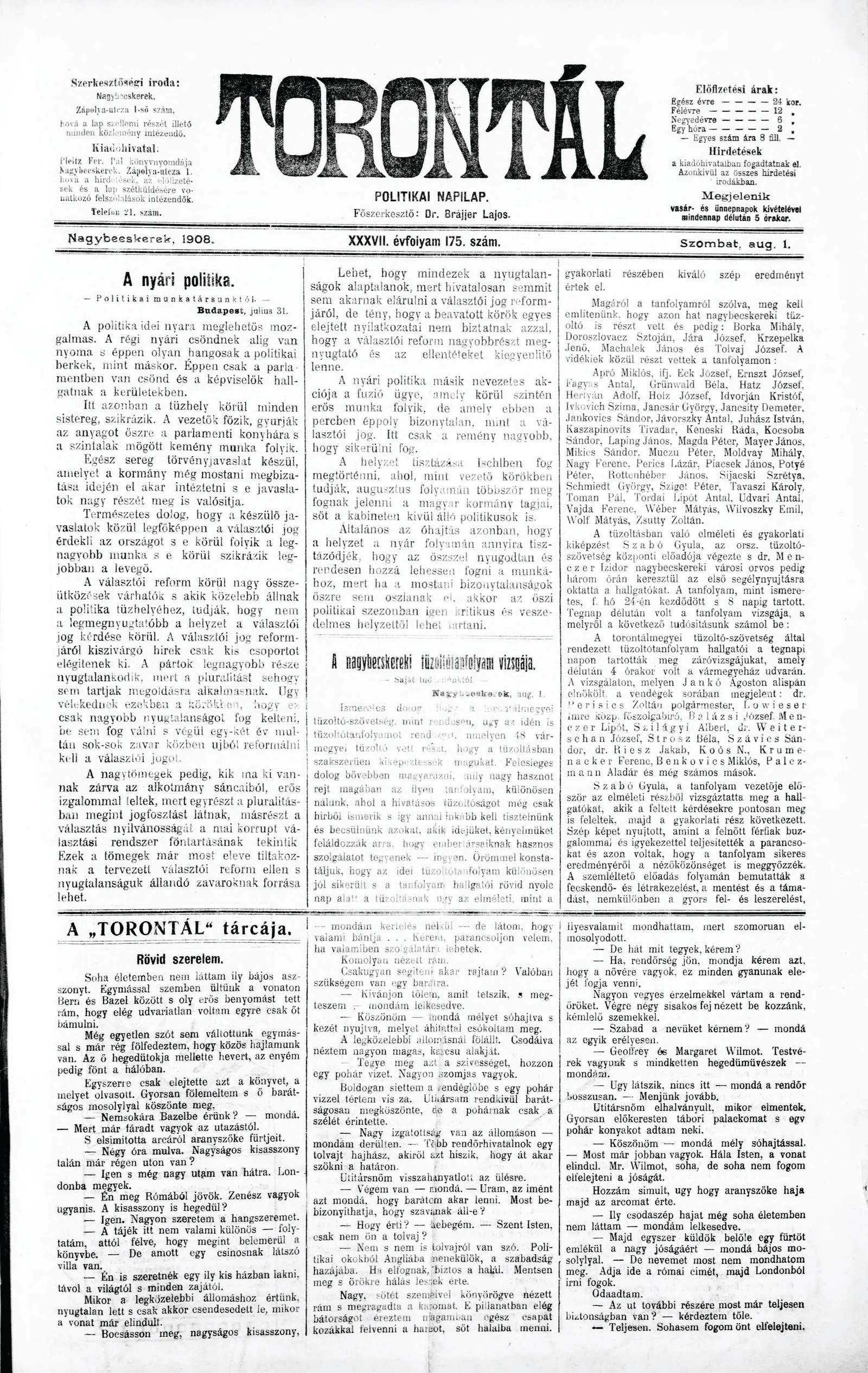 Torontál, 37. évf. 1908. augusztus 1. 175. sz.