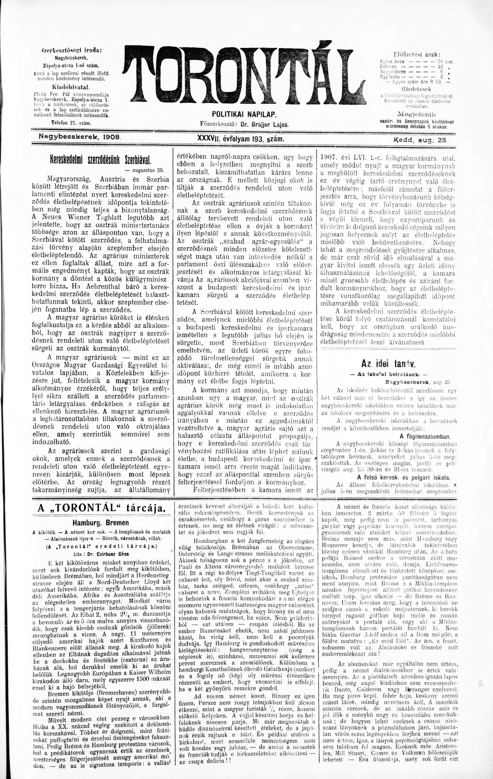 Torontál, 37. évf. 1908. augusztus 25. 193. sz.