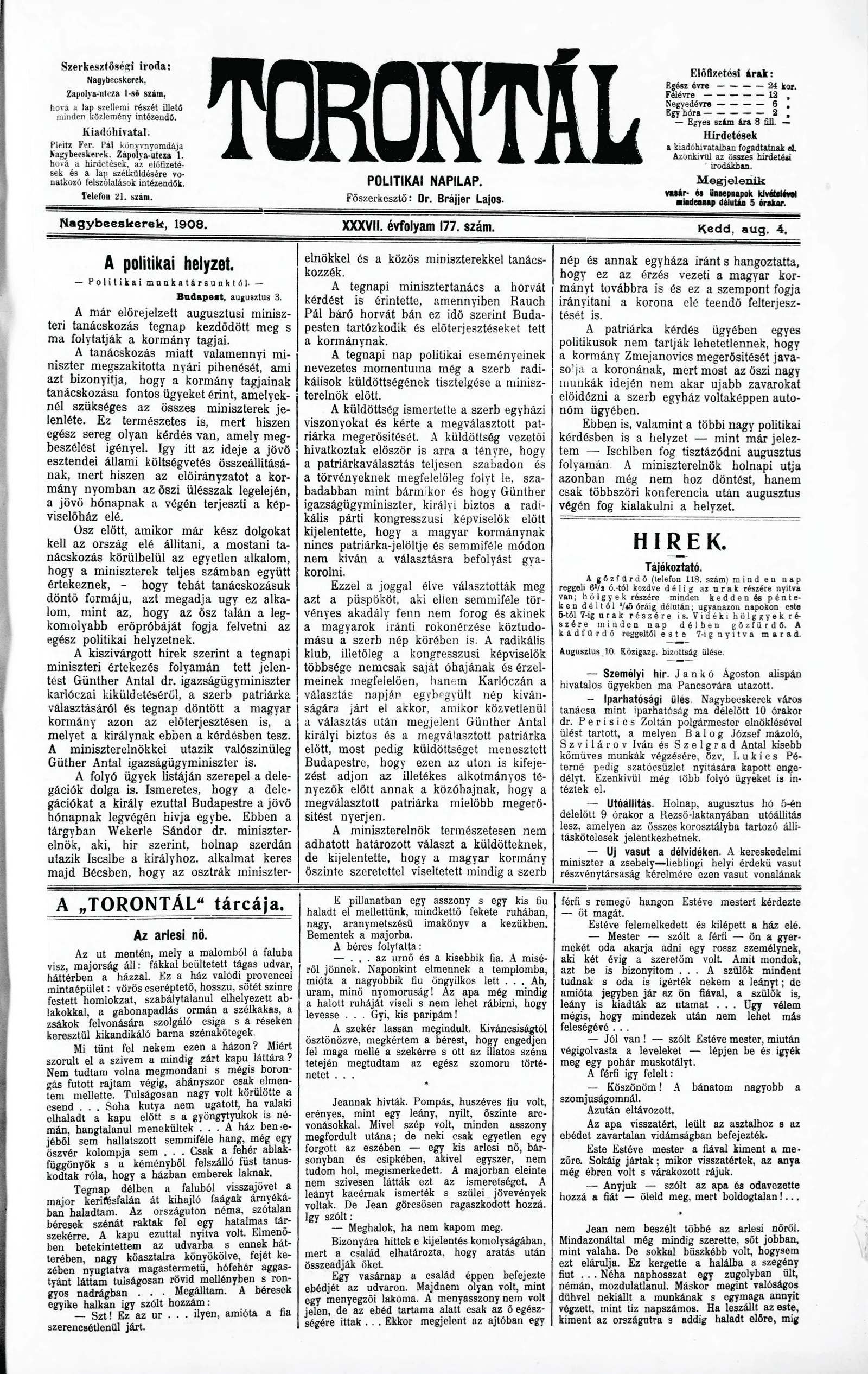 Torontál, 37. évf. 1908. augusztus 4. 177. sz.