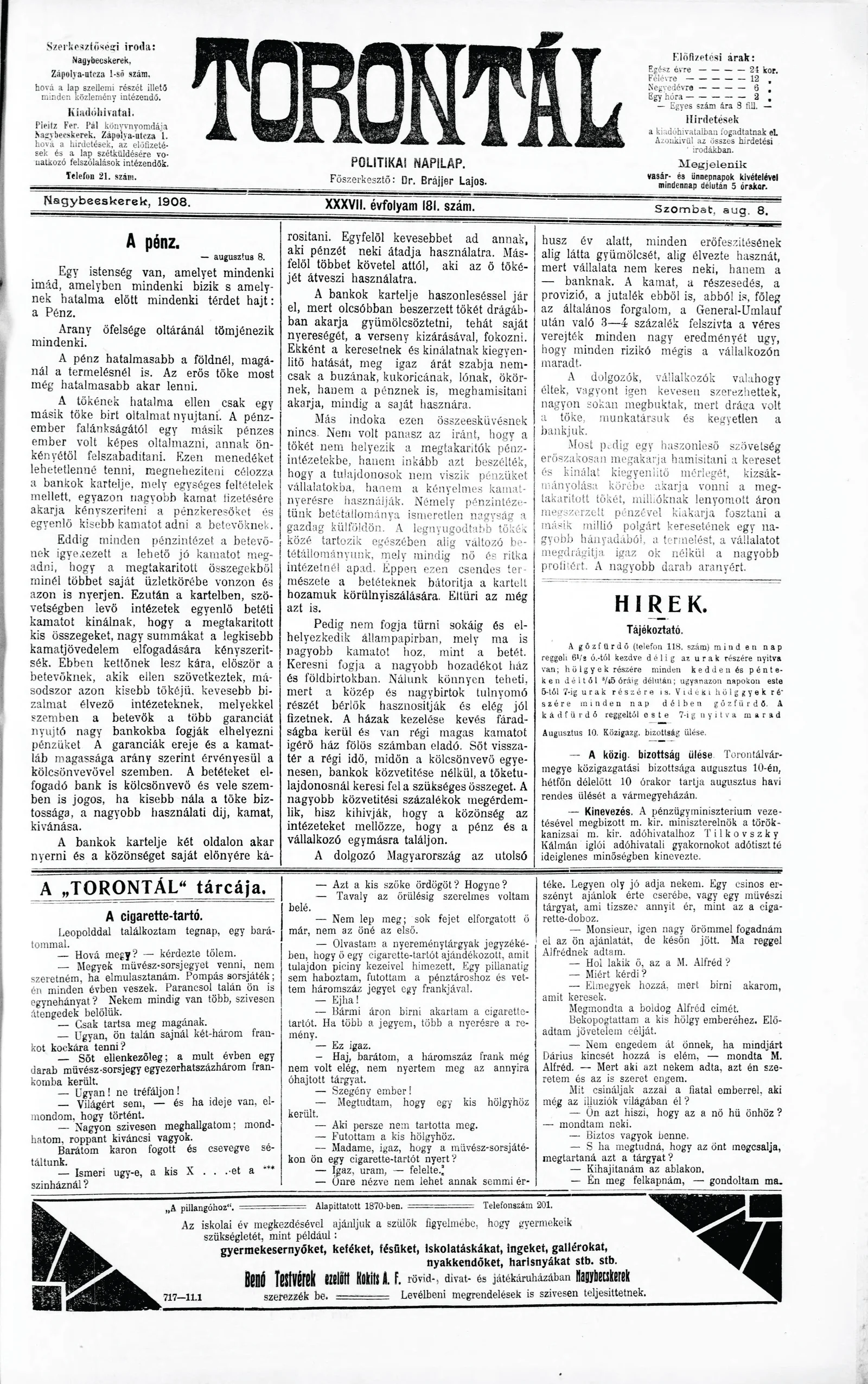 Torontál, 37. évf. 1908. augusztus 8. 181. sz.