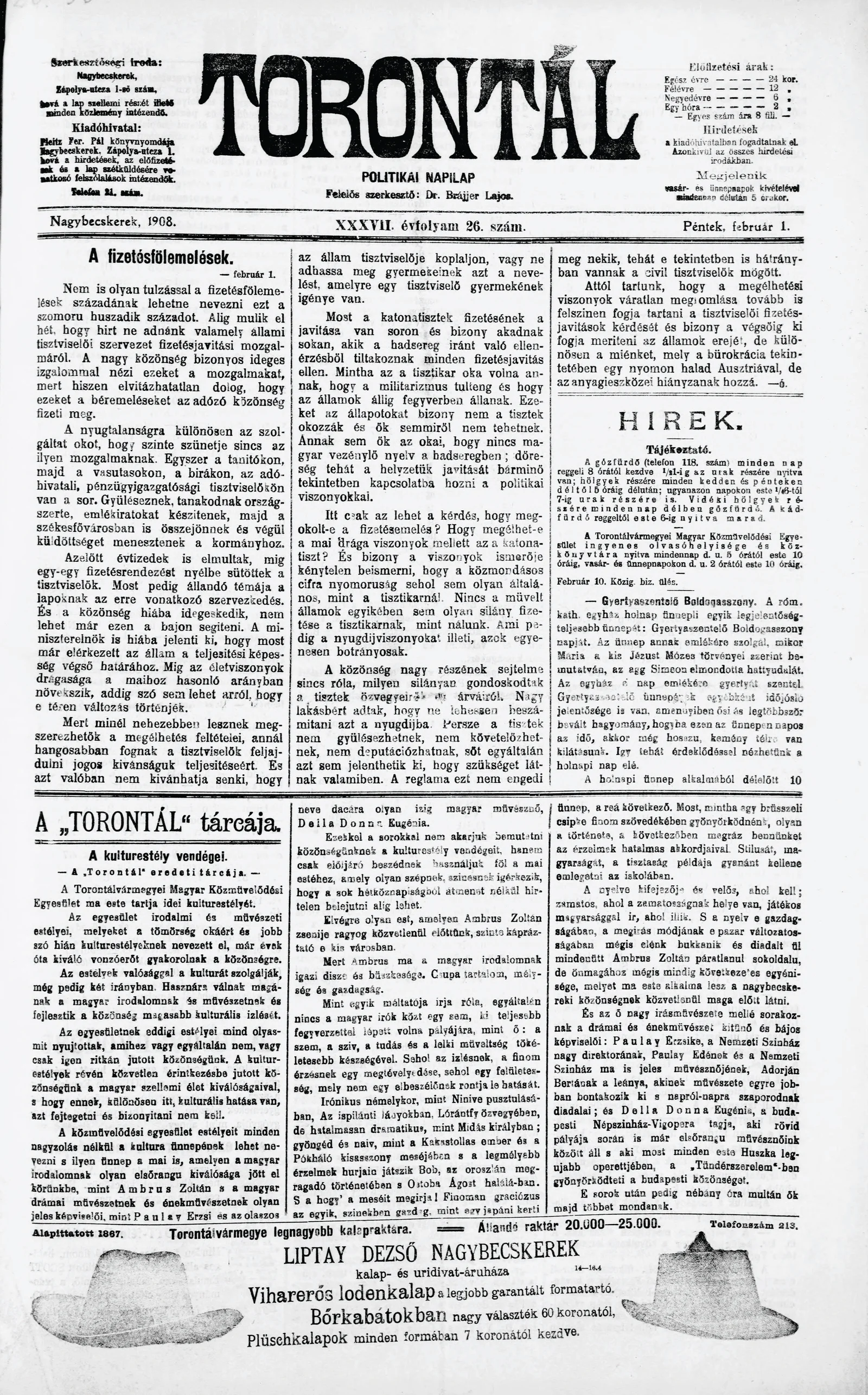 Torontál, 37. évf. 1908. február 1. 26. sz.