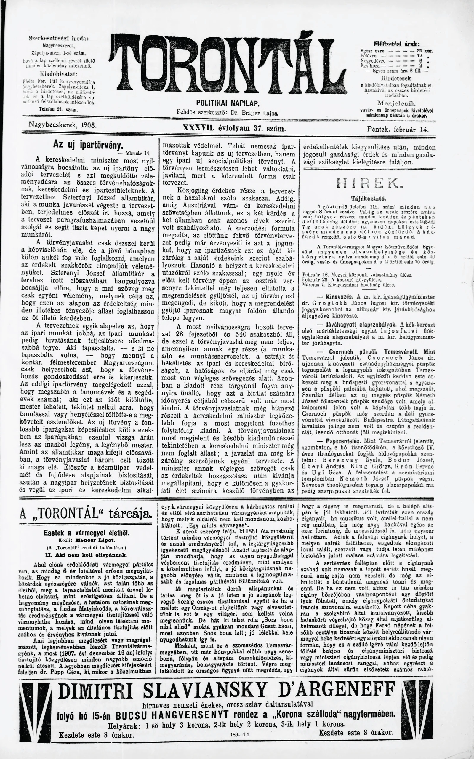 Torontál, 37. évf. 1908. február 14. 37. sz.