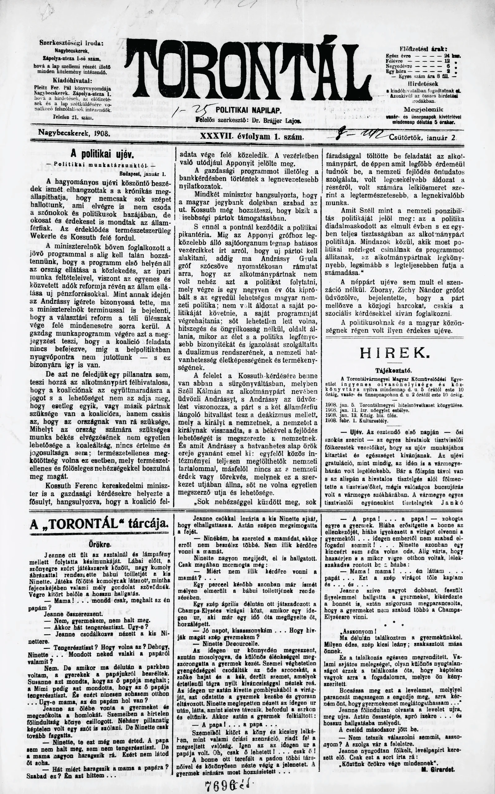 Torontál, 37. évf. 1908. január 2. 1. sz.