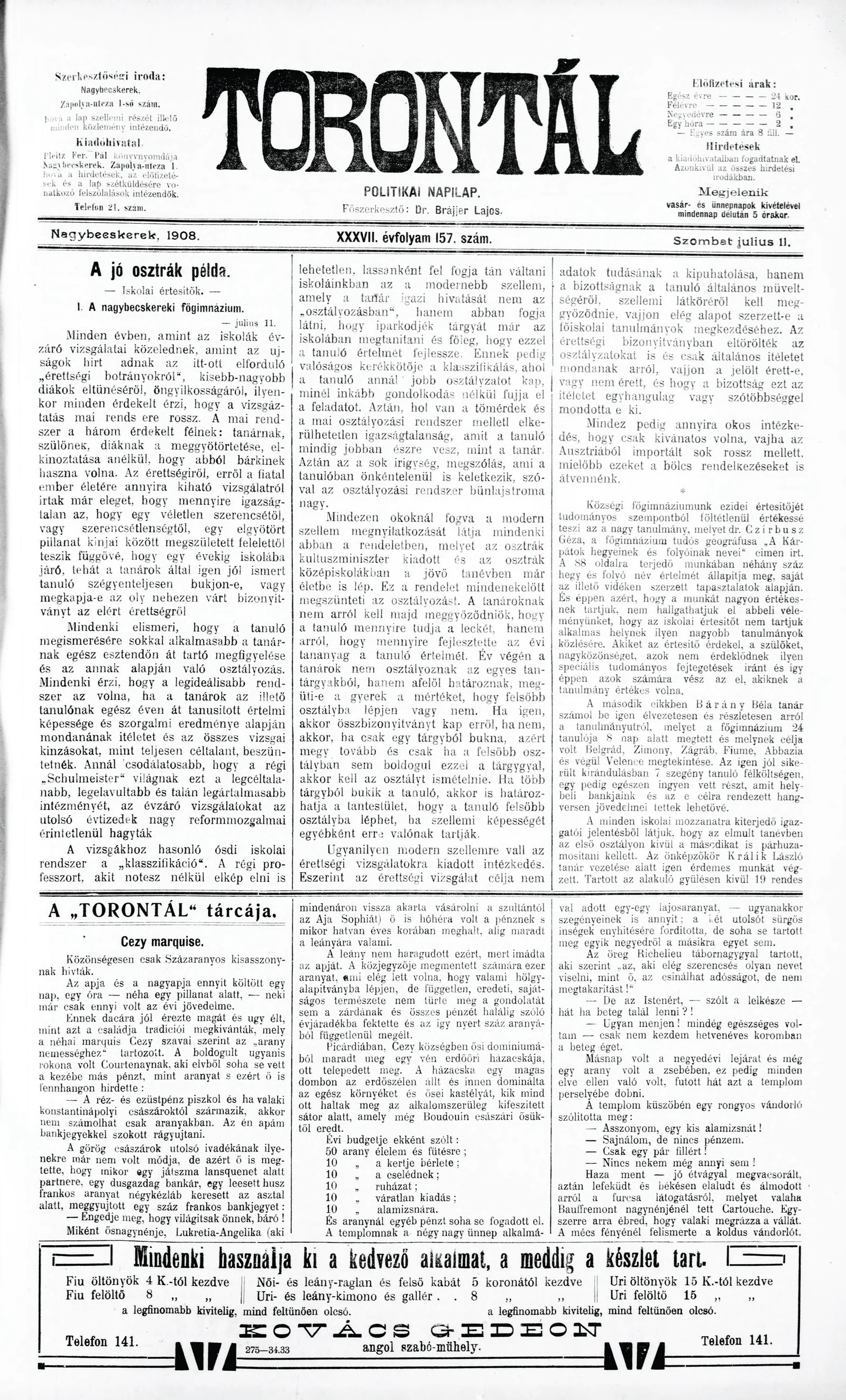 Torontál, 37. évf. 1908. július 11. 157. sz.