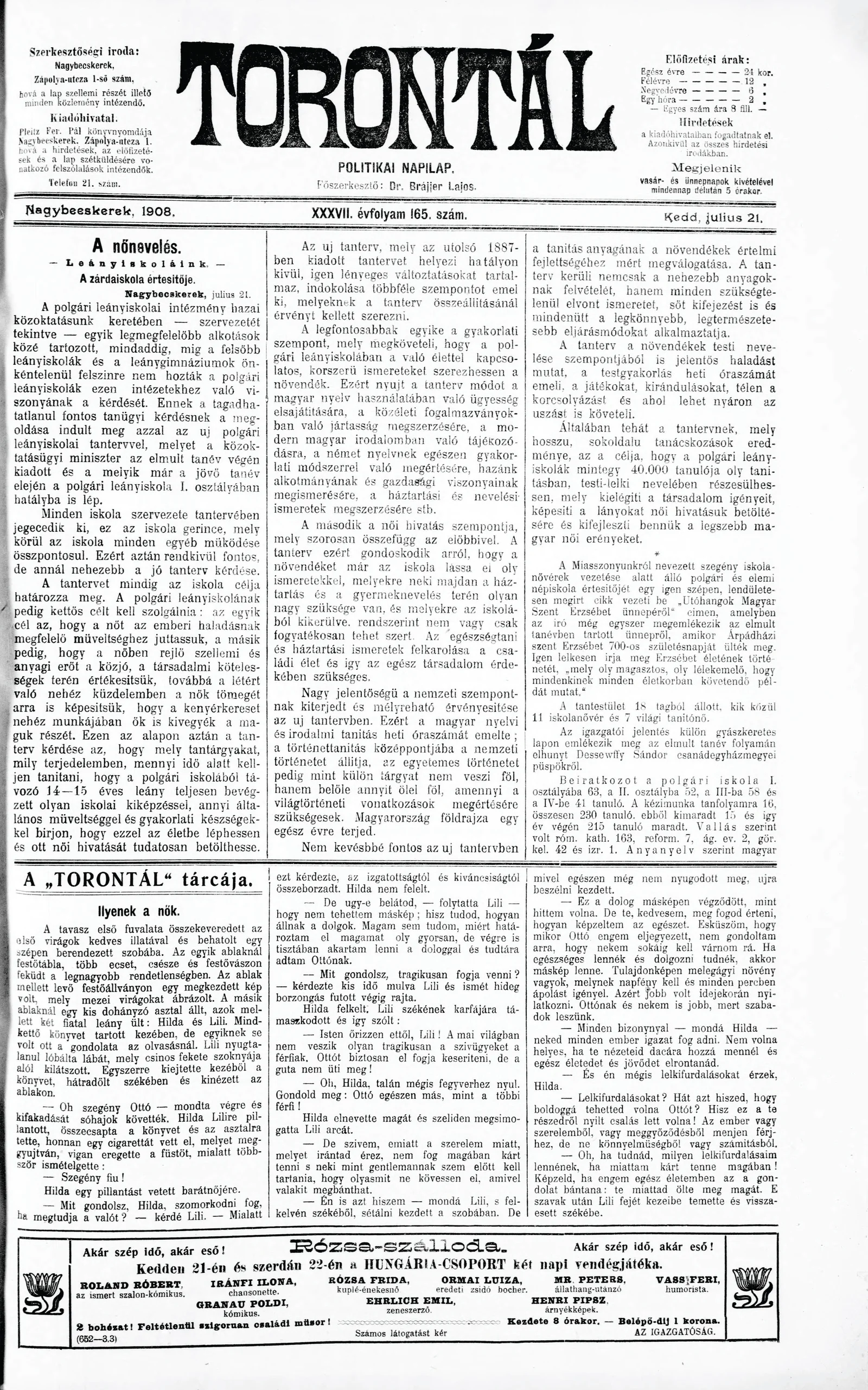 Torontál, 37. évf. 1908. július 21. 165. sz.
