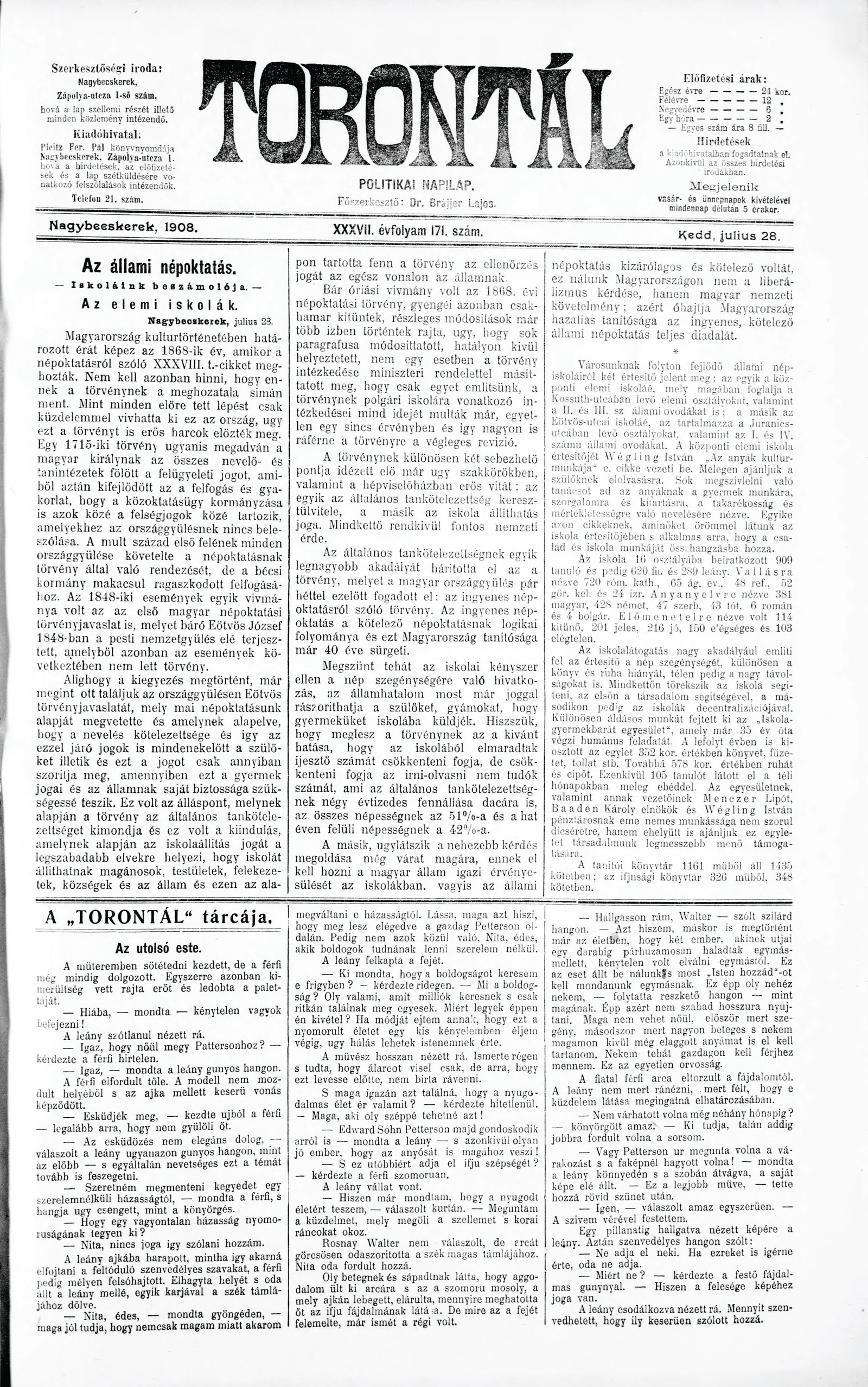 Torontál, 37. évf. 1908. július 28. 171. sz.