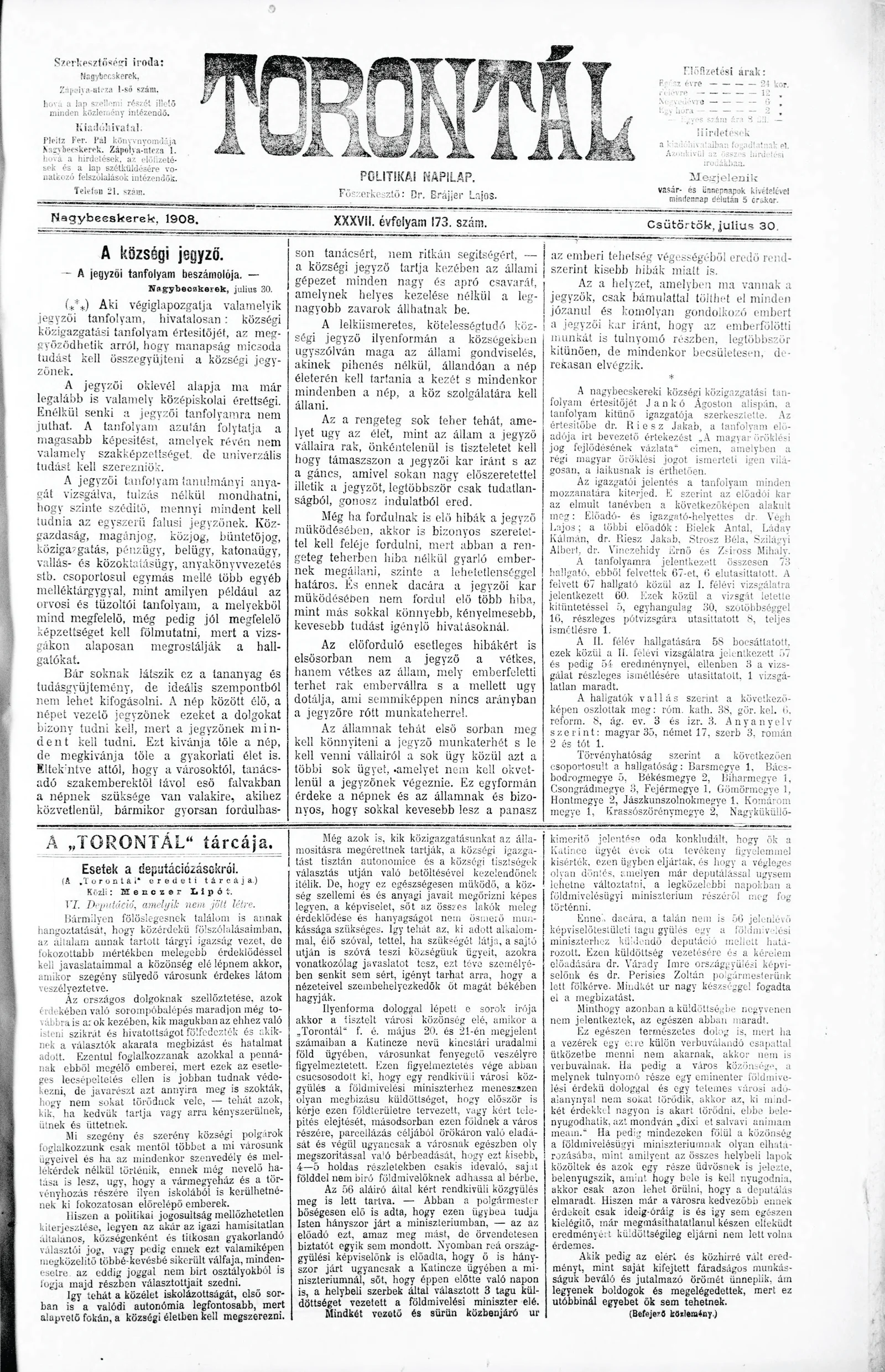 Torontál, 37. évf. 1908. július 30. 173. sz.