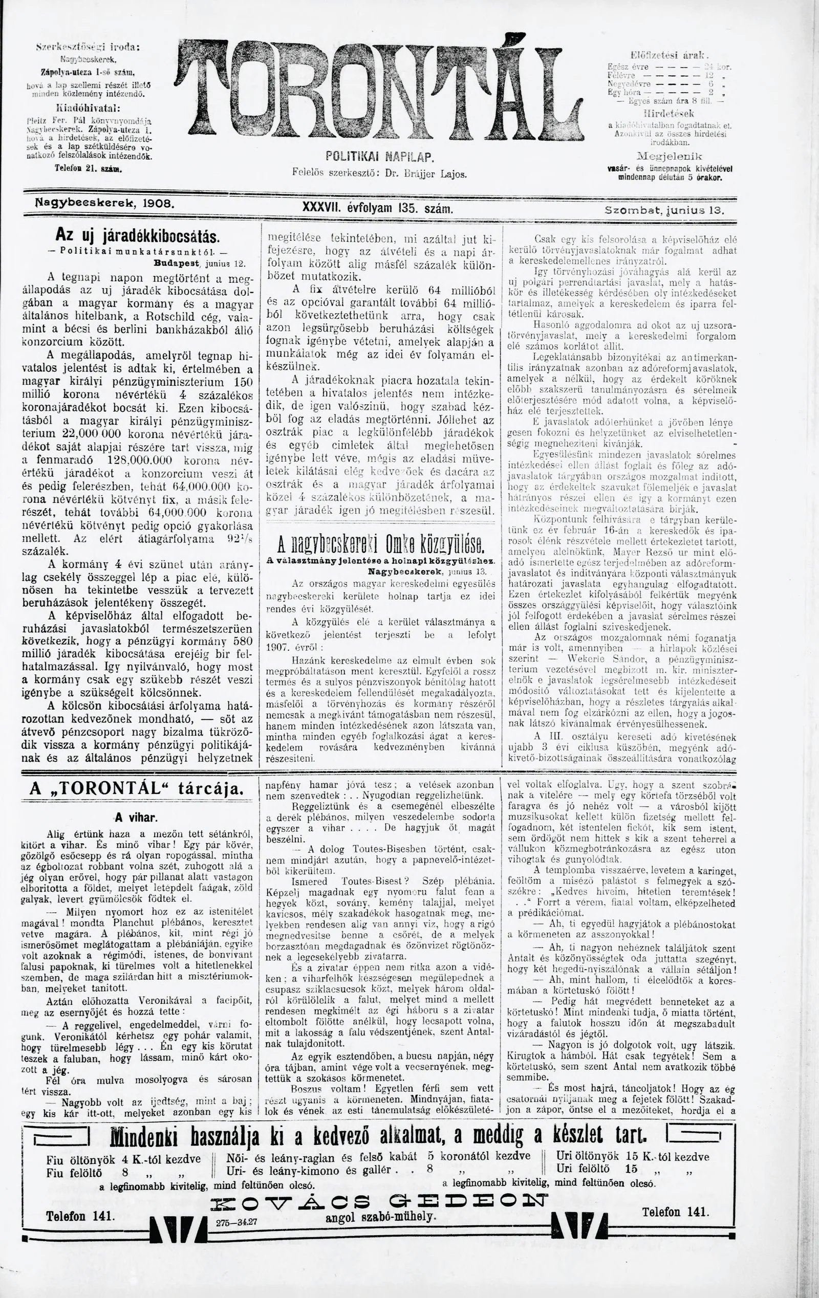 Torontál, 37. évf. 1908. június 13. 135. sz.
