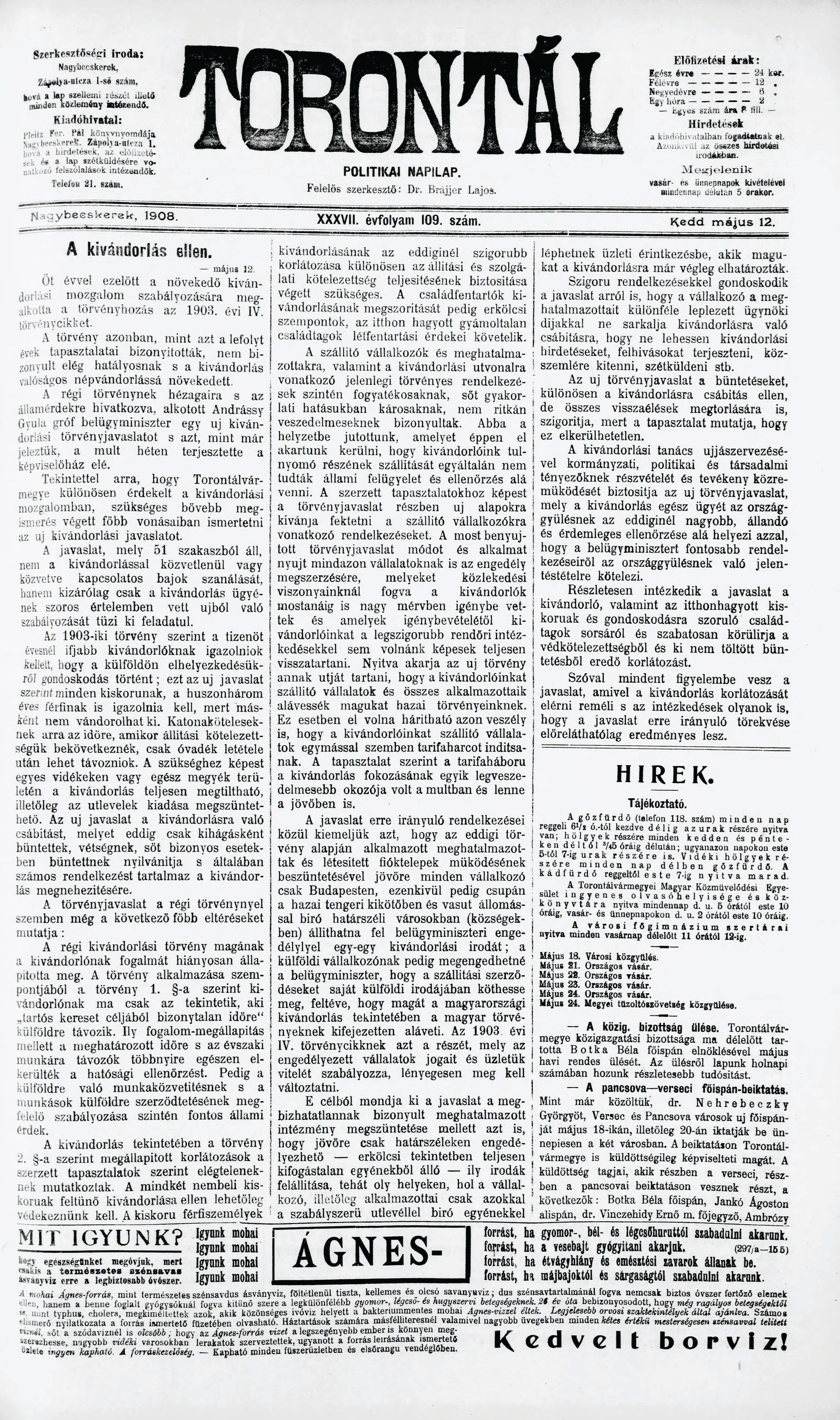 Torontál, 37. évf. 1908. május 12. 109. sz.