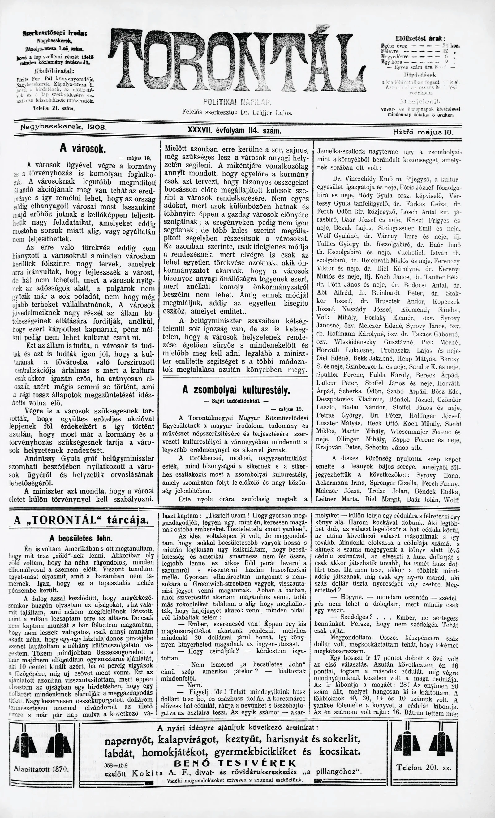 Torontál, 37. évf. 1908. május 18. 114. sz.