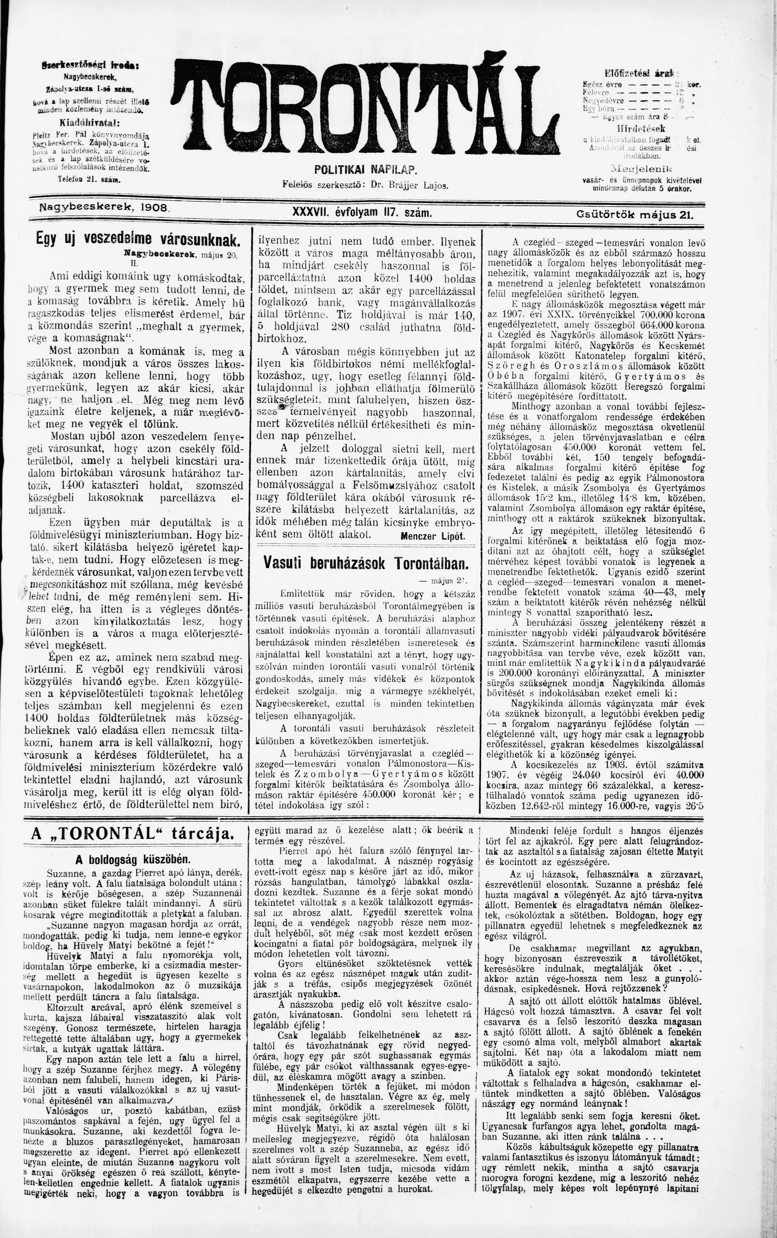 Torontál, 37. évf. 1908. május 21. 117. sz.