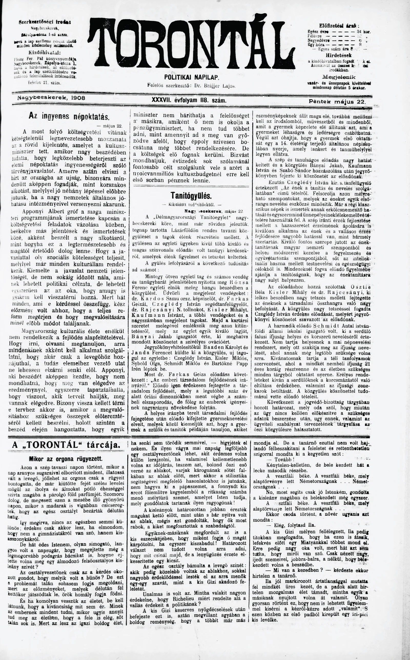 Torontál, 37. évf. 1908. május 22. 118. sz.