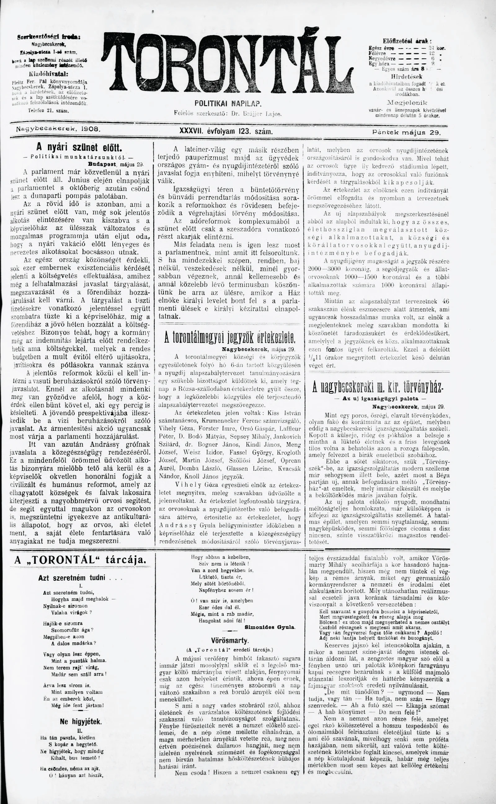 Torontál, 37. évf. 1908. május 29. 123. sz.