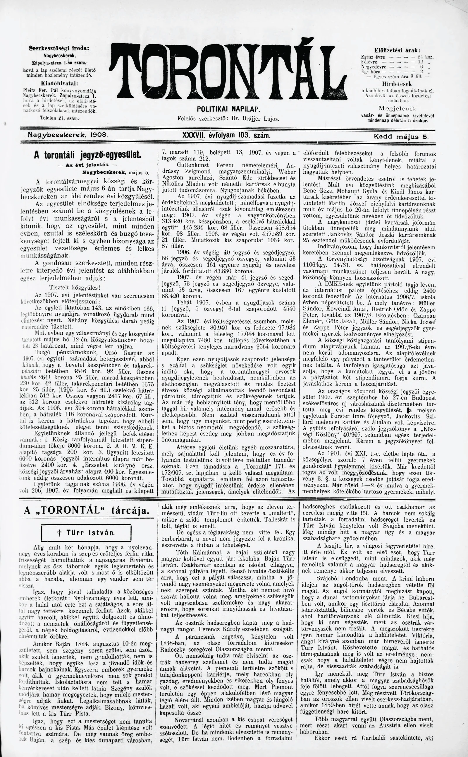 Torontál, 37. évf. 1908. május 5. 103. sz.