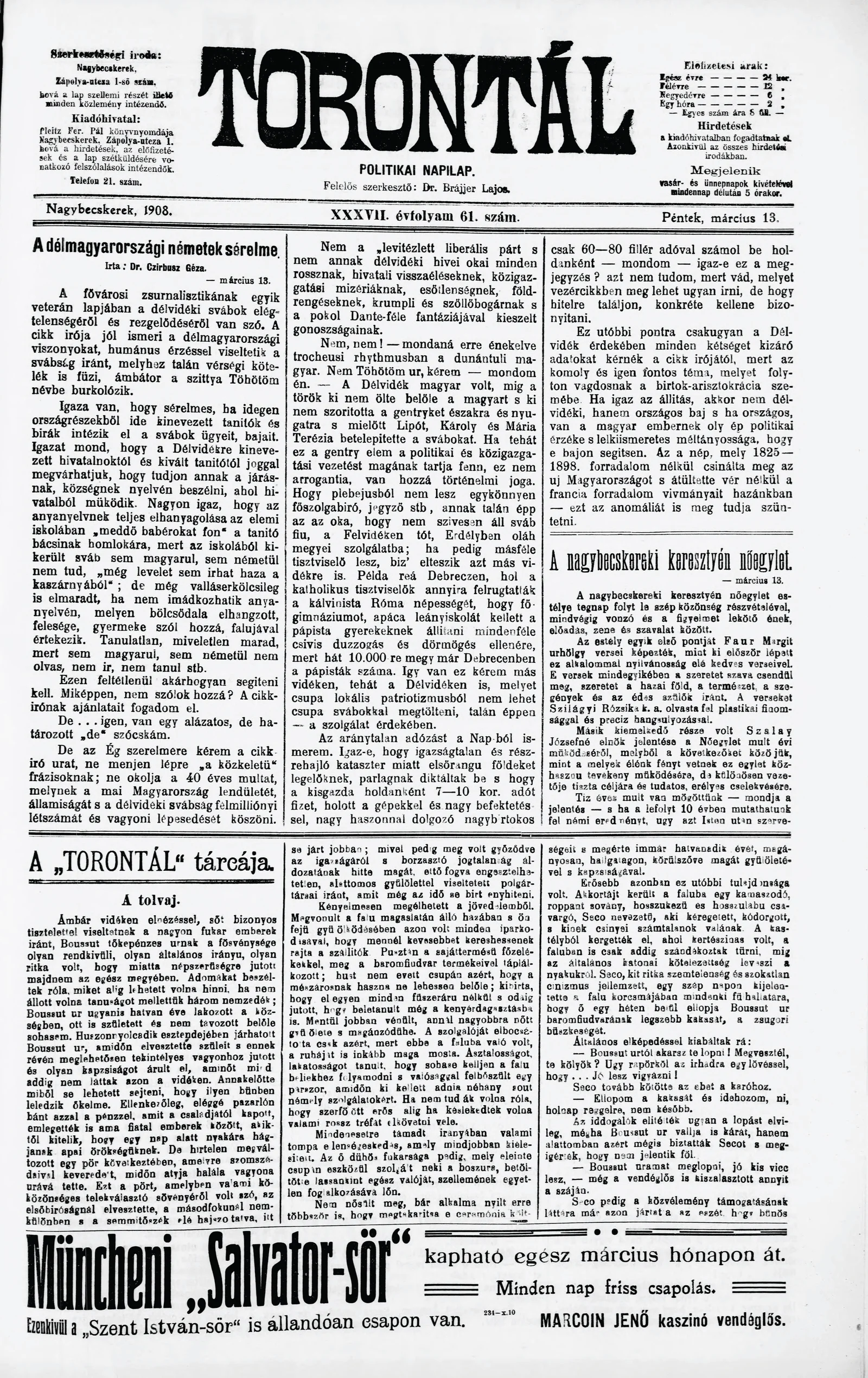 Torontál, 37. évf. 1908. március 13. 61. sz.
