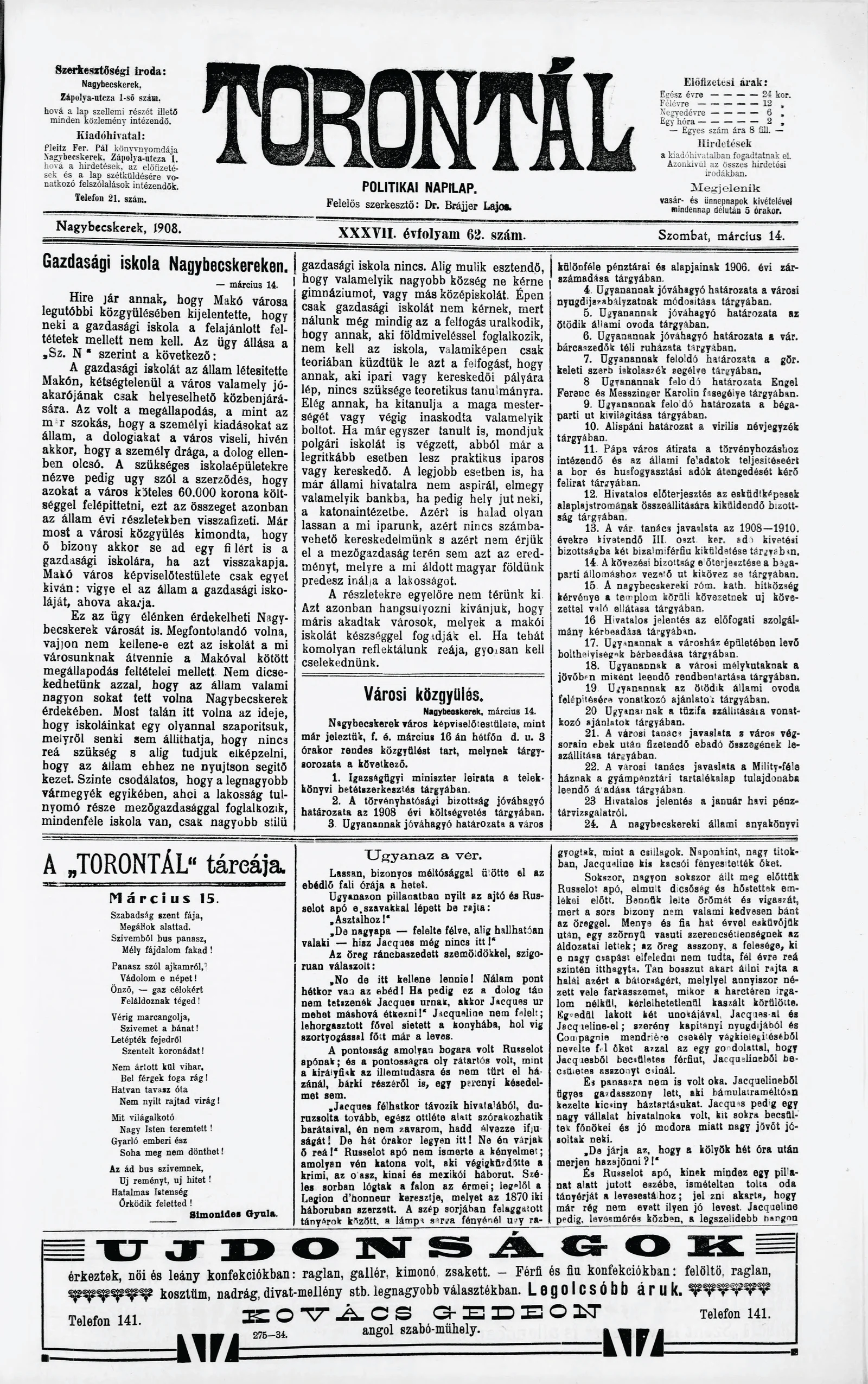 Torontál, 37. évf. 1908. március 14. 62. sz.