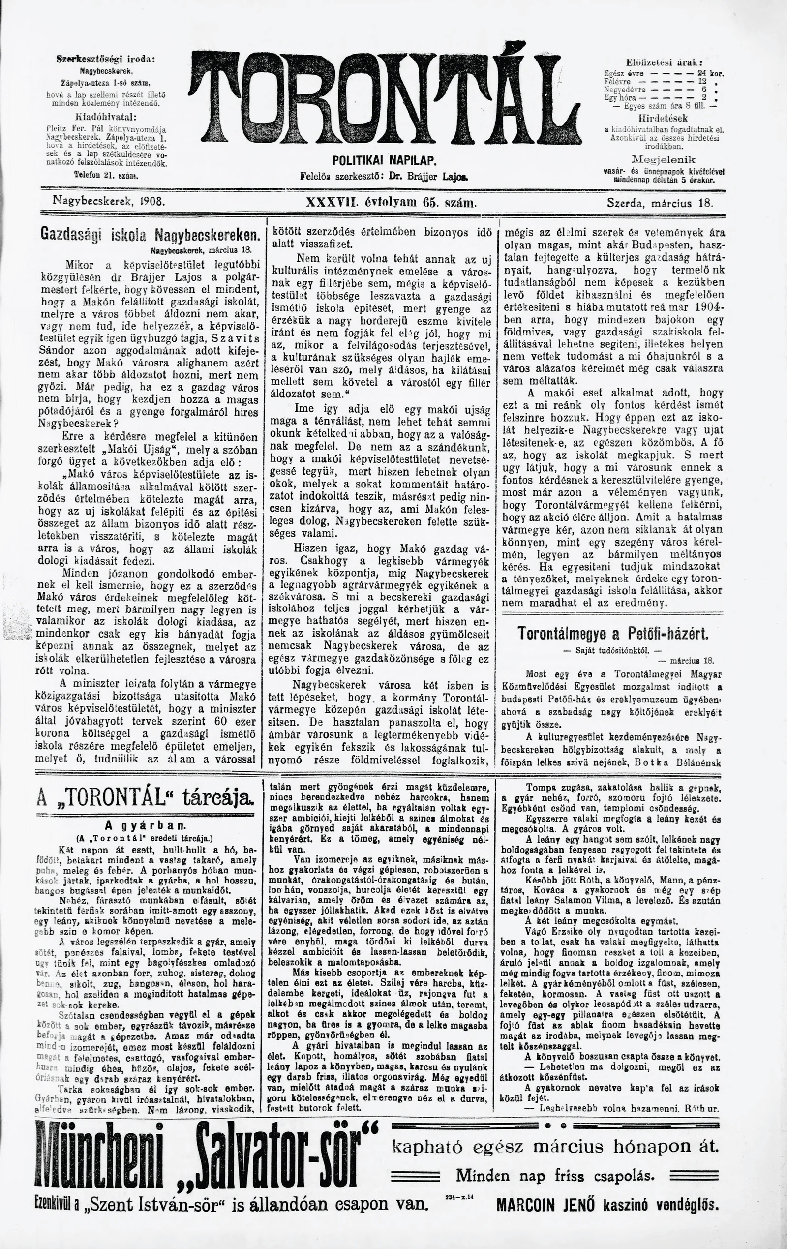 Torontál, 37. évf. 1908. március 18. 65. sz.
