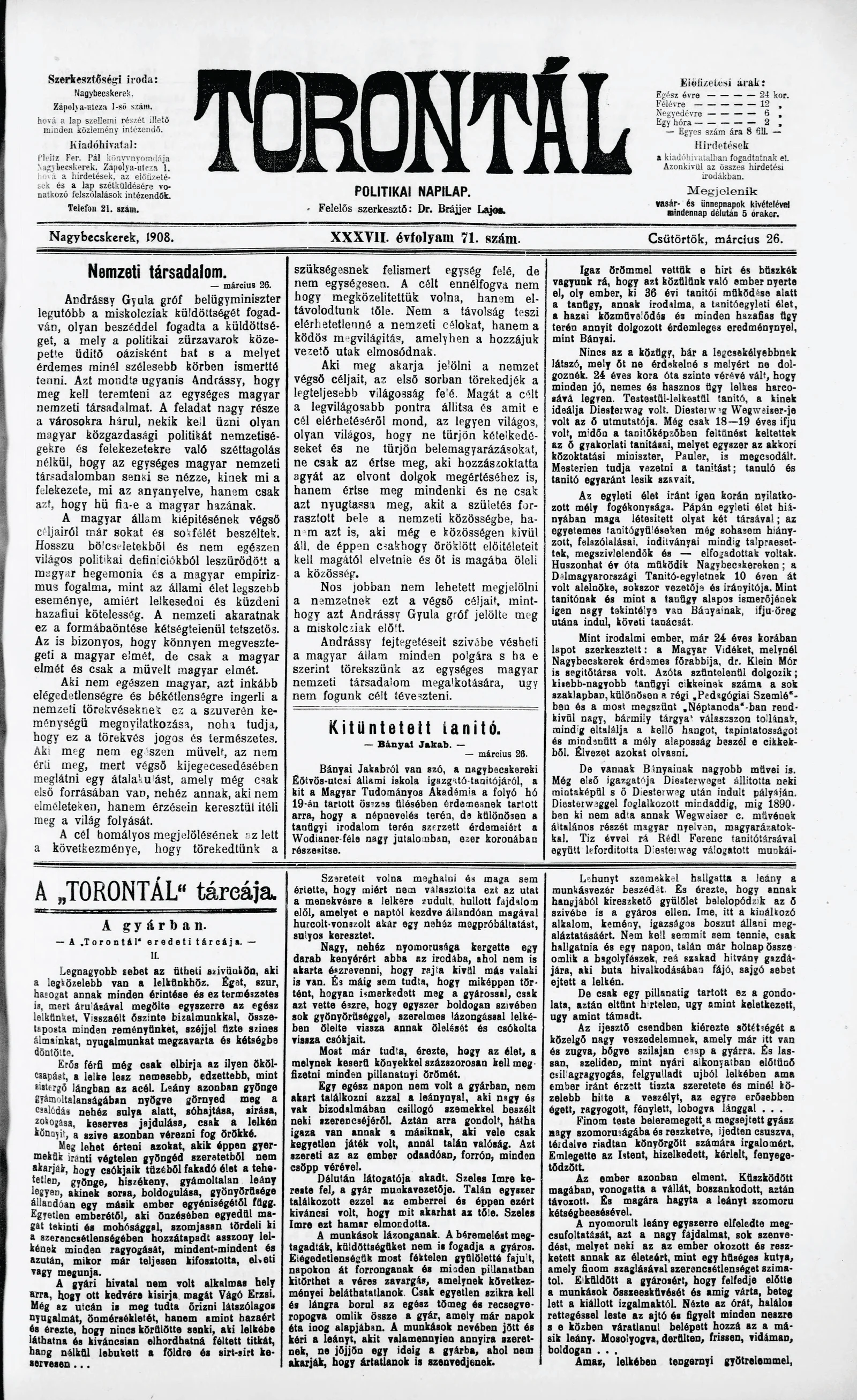 Torontál, 37. évf. 1908. március 26. 71. sz.