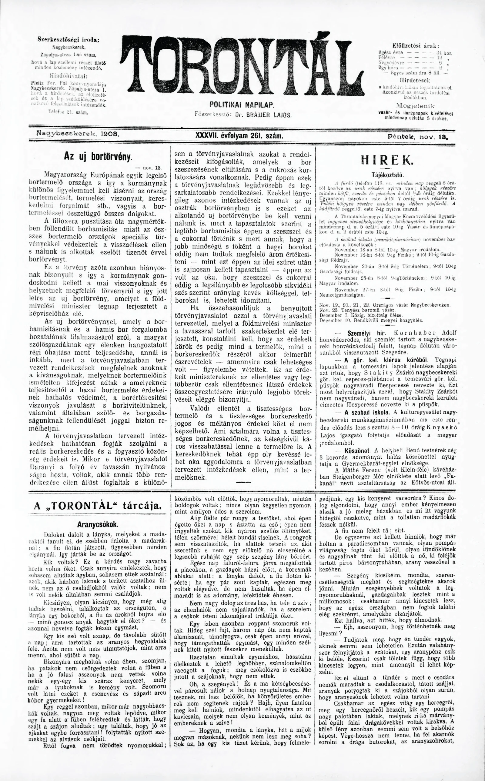 Torontál, 37. évf. 1908. november 13. 261. sz.