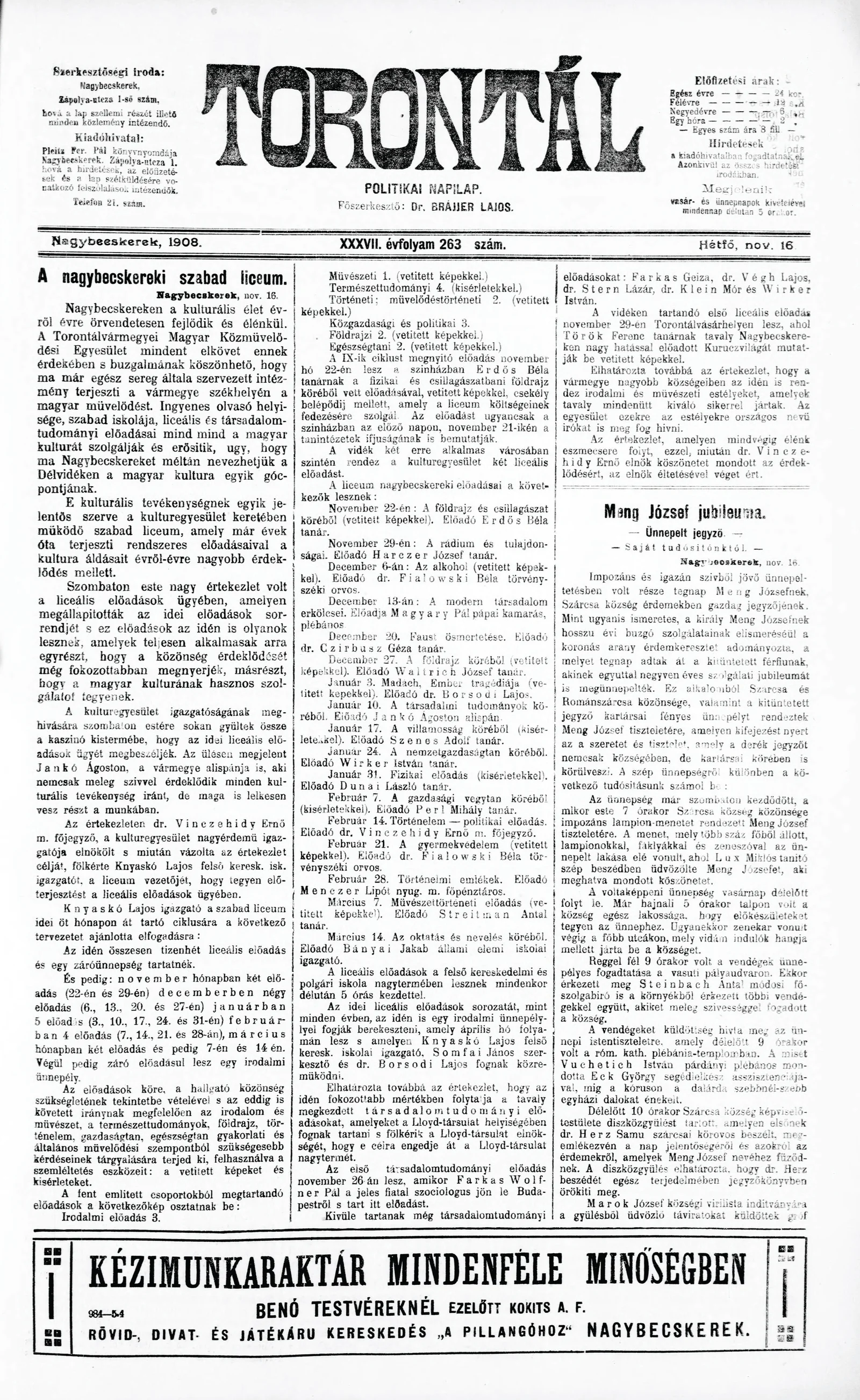 Torontál, 37. évf. 1908. november 16. 263. sz.
