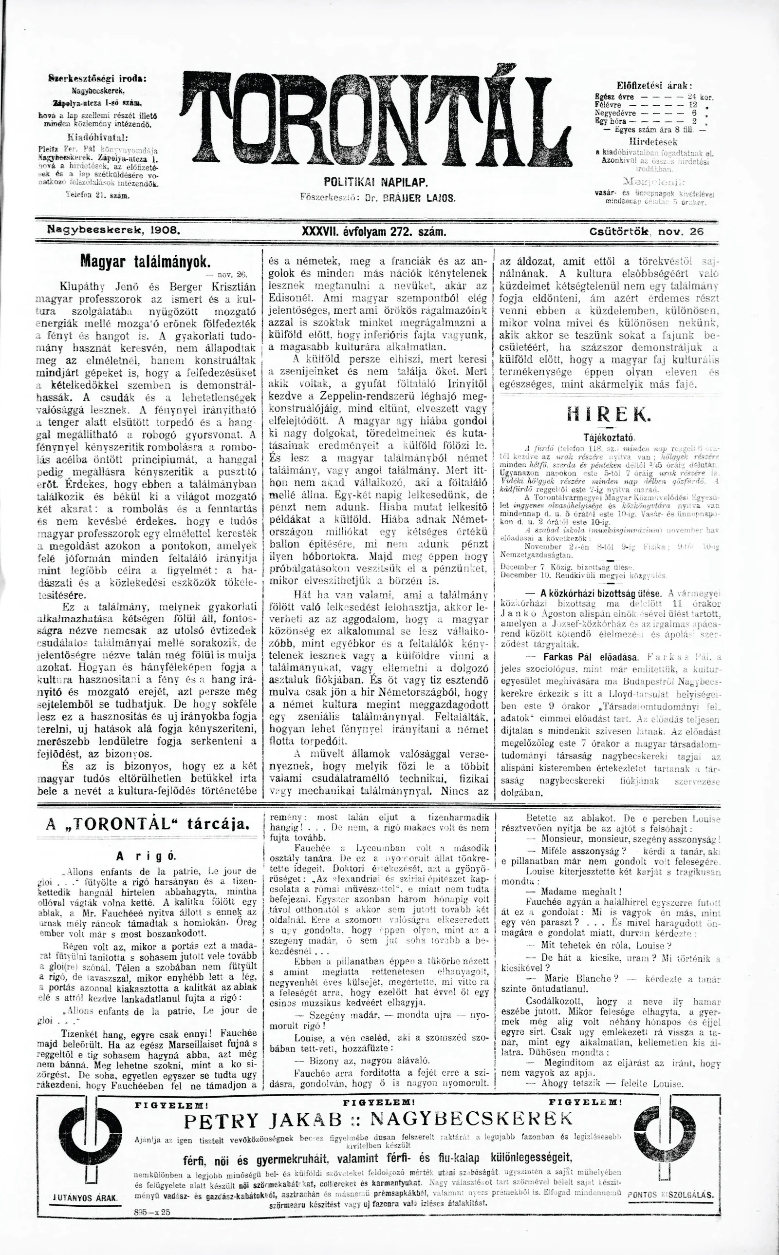 Torontál, 37. évf. 1908. november 26. 272. sz.