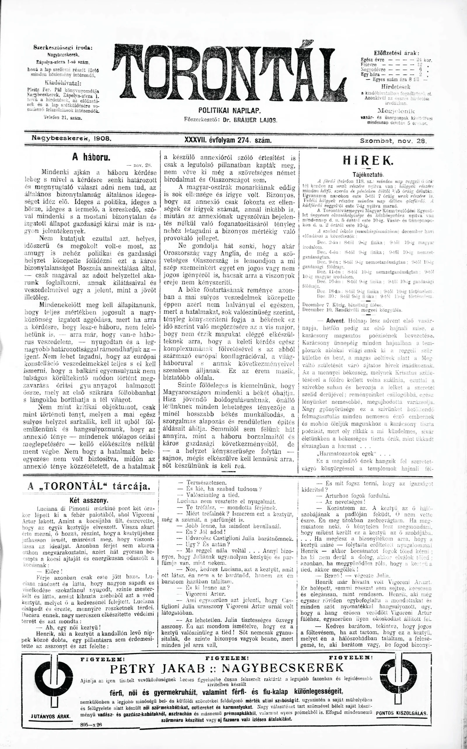 Torontál, 37. évf. 1908. november 28. 274. sz.