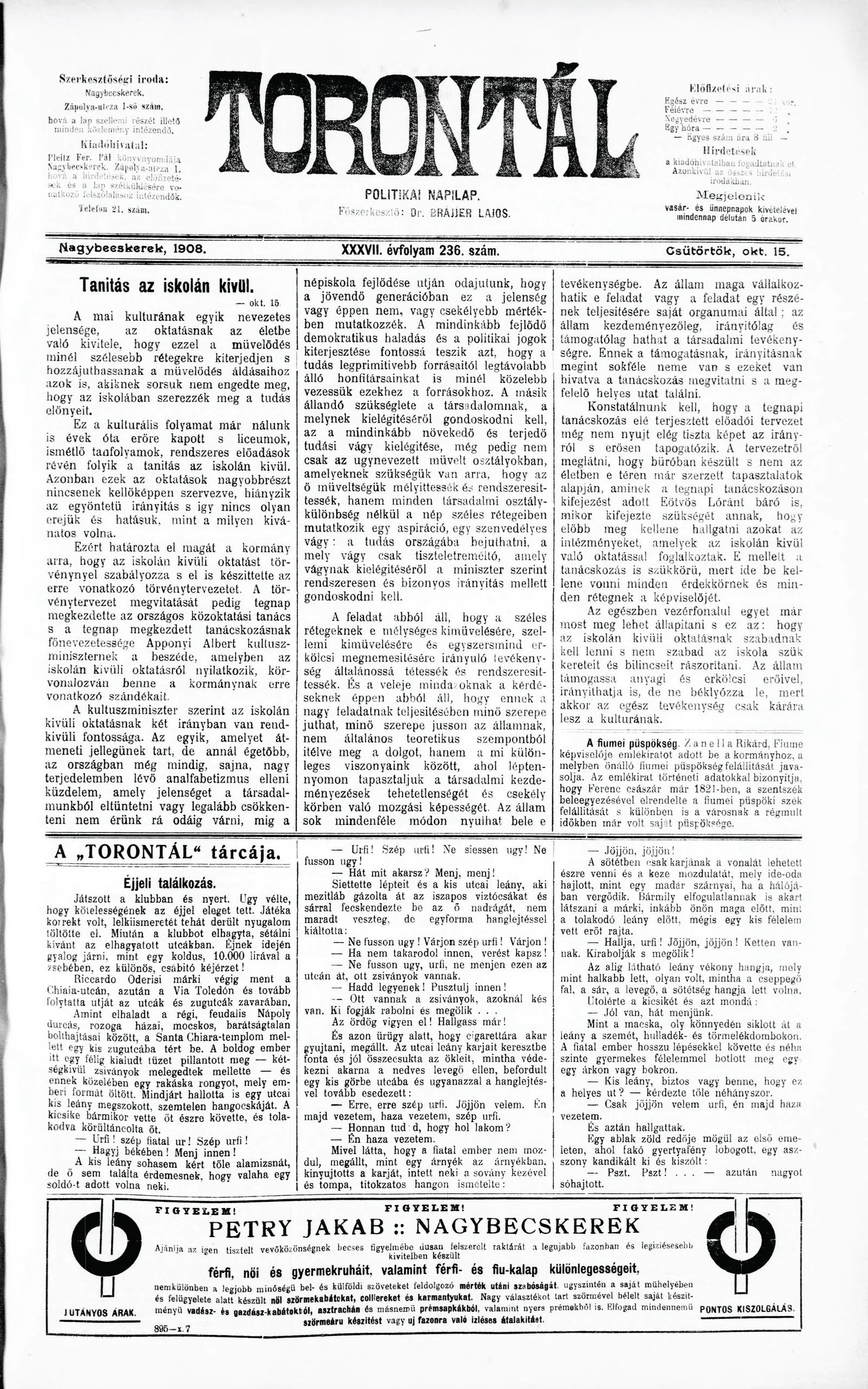 Torontál, 37. évf. 1908. október 15. 236. sz.