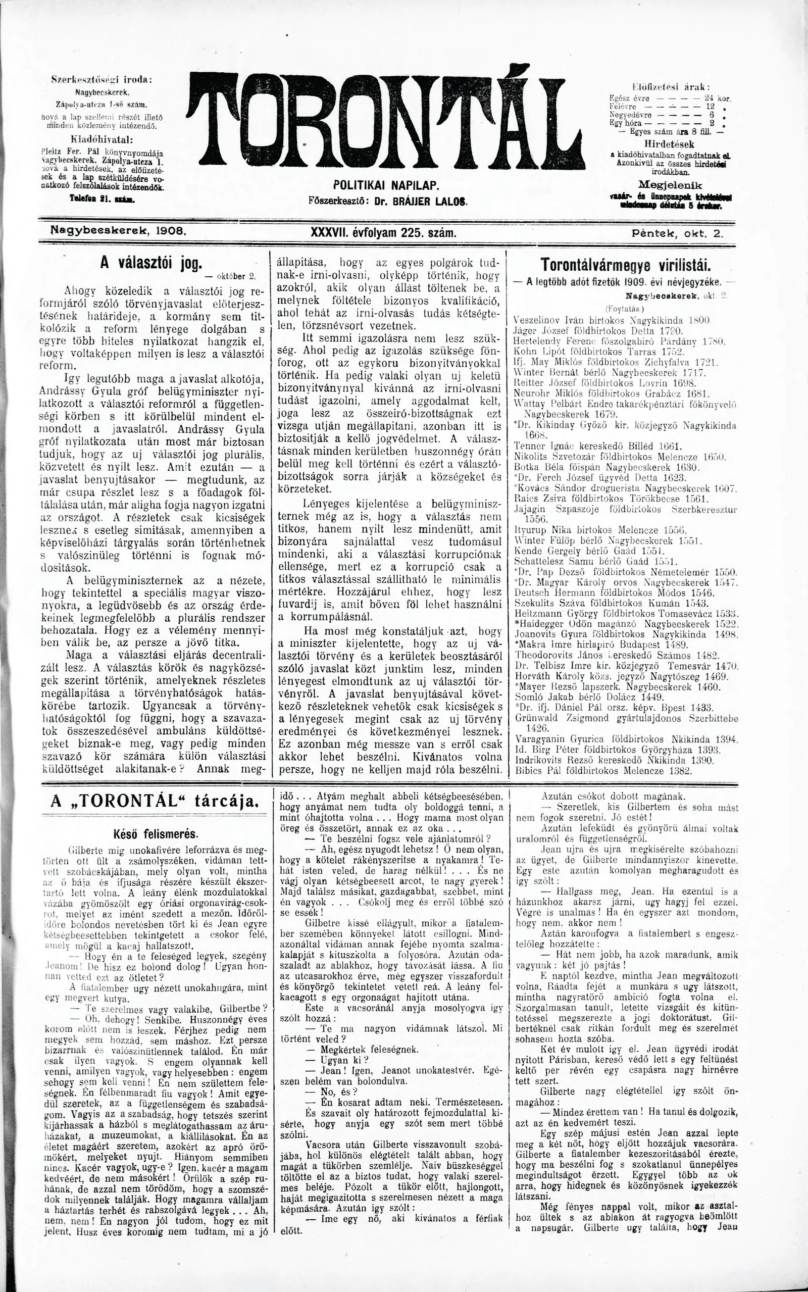 Torontál, 37. évf. 1908. október 2. 225. sz.
