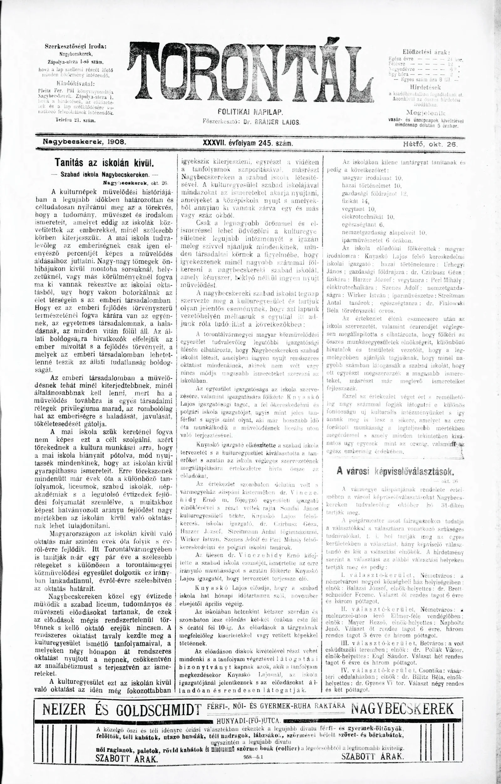 Torontál, 37. évf. 1908. október 26. 245. sz.