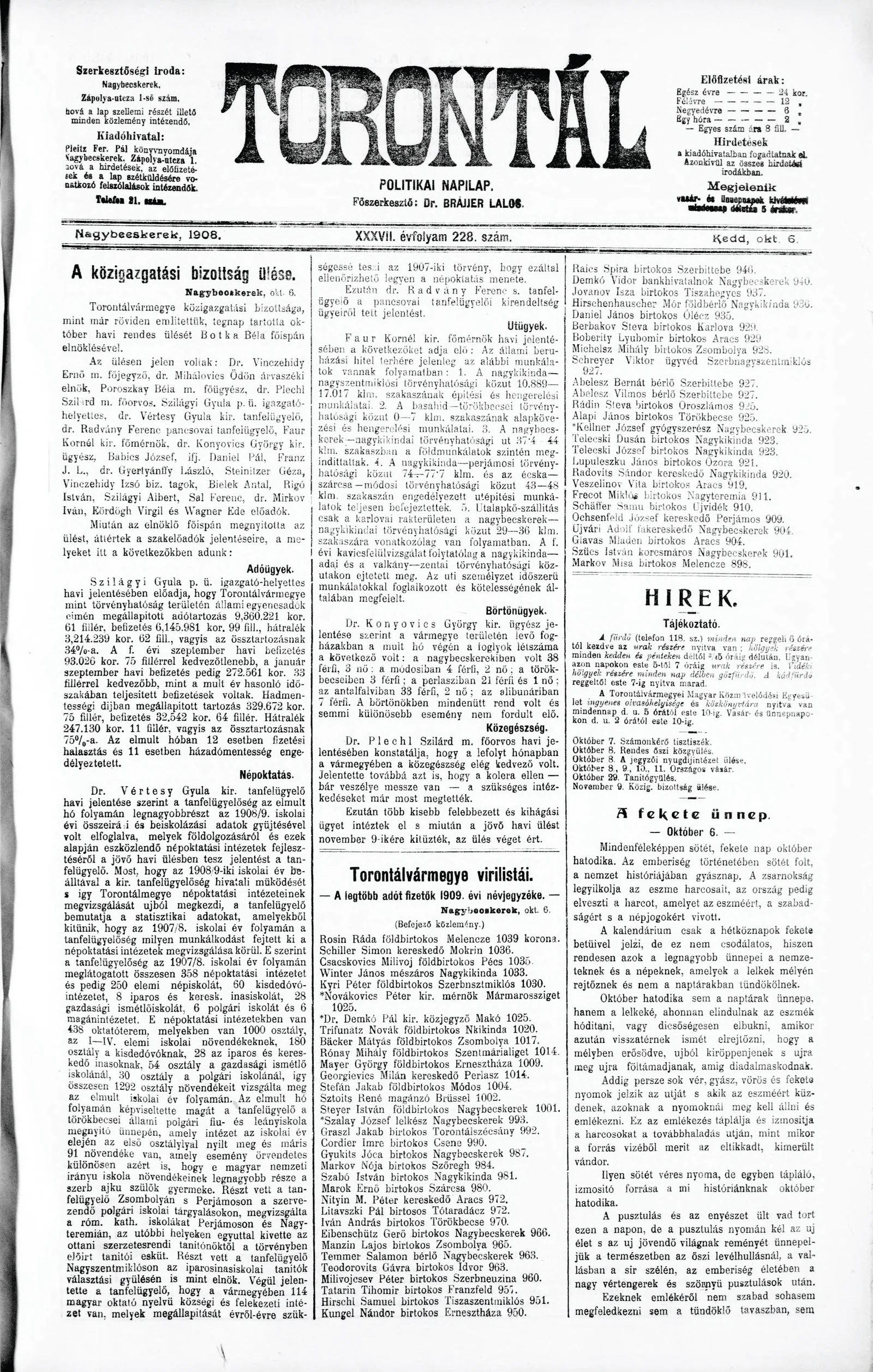 Torontál, 37. évf. 1908. október 6. 228. sz.