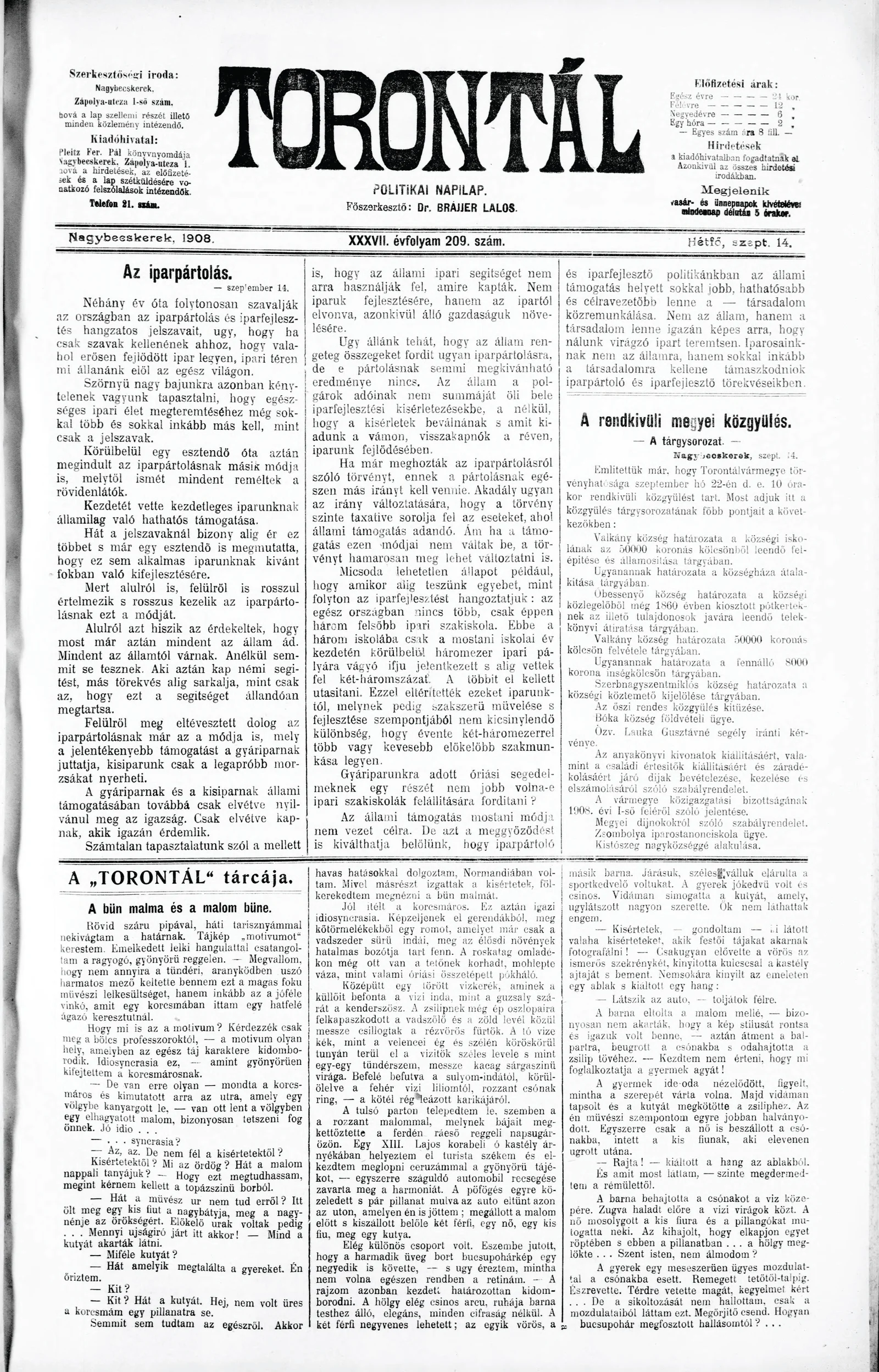 Torontál, 37. évf. 1908. szeptember 14. 209. sz.