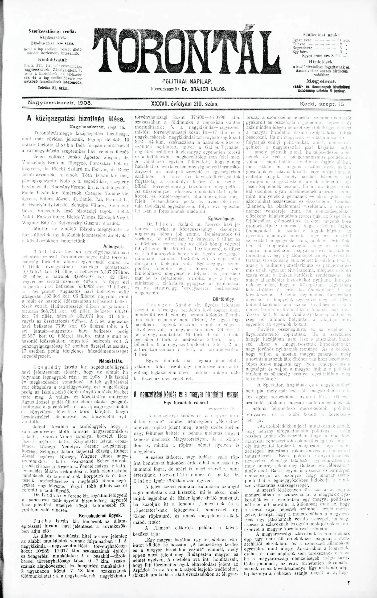 Torontál, 37. évf. 1908. szeptember 15. 210. sz.